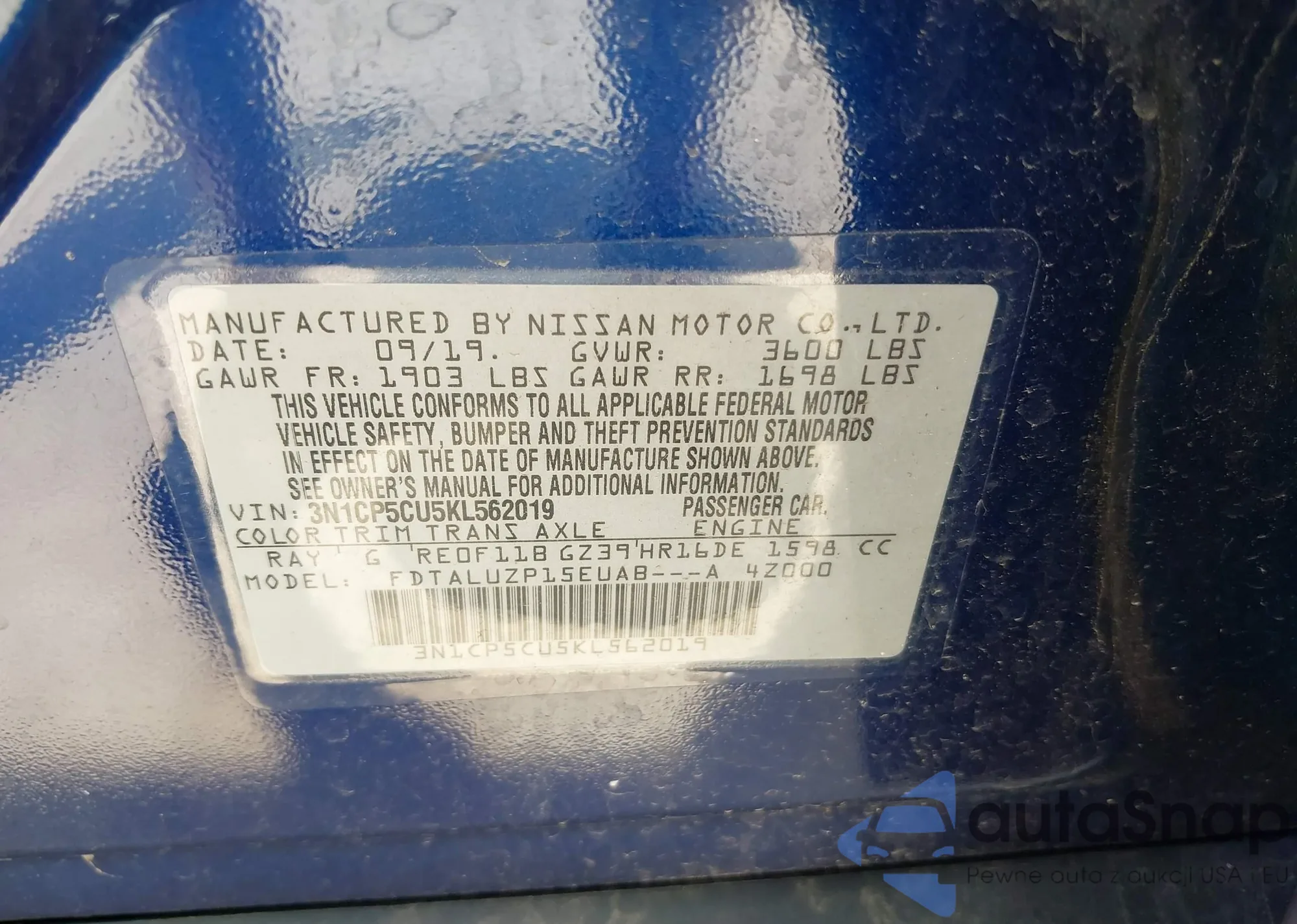 The car Nissan Kicks 2019 (VIN 3N1CP5CU5KL562019) is sold by an unverified seller. We recommend checking the Carfax report and confirming registration possibilities before purchase.