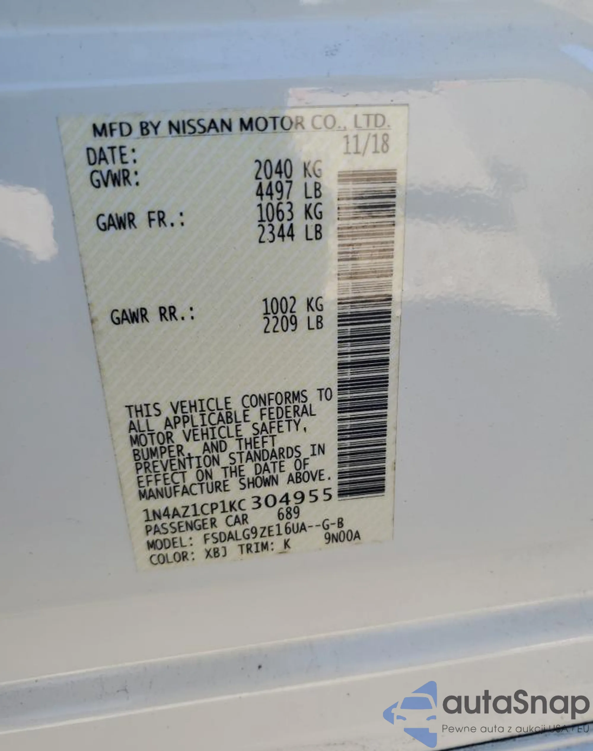 VIN: 1N4AZ1CP1KC304955