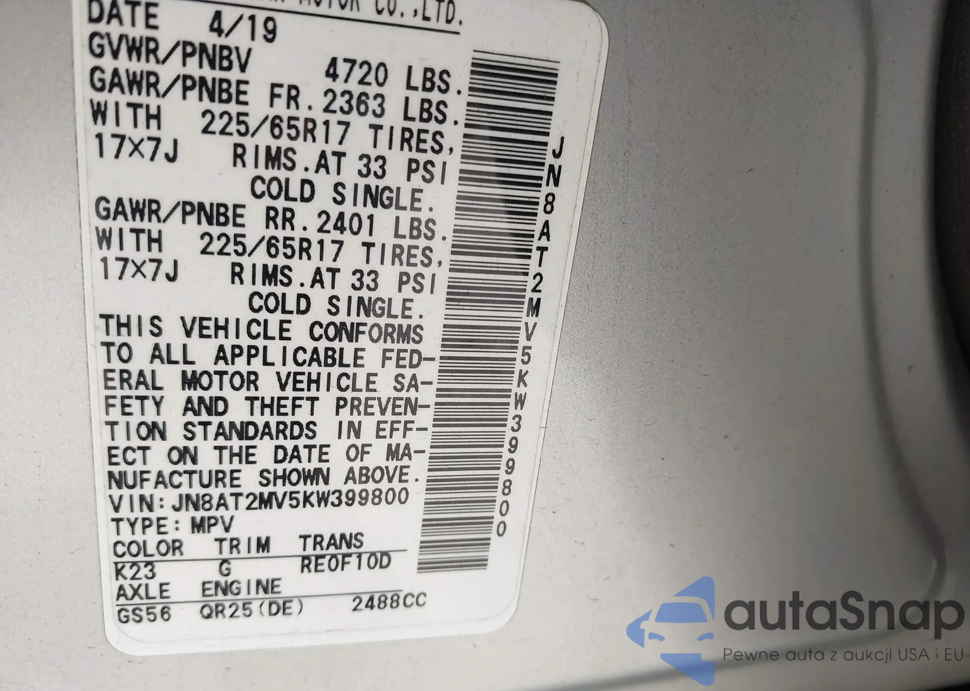 VIN: JN8AT2MV5KW399800