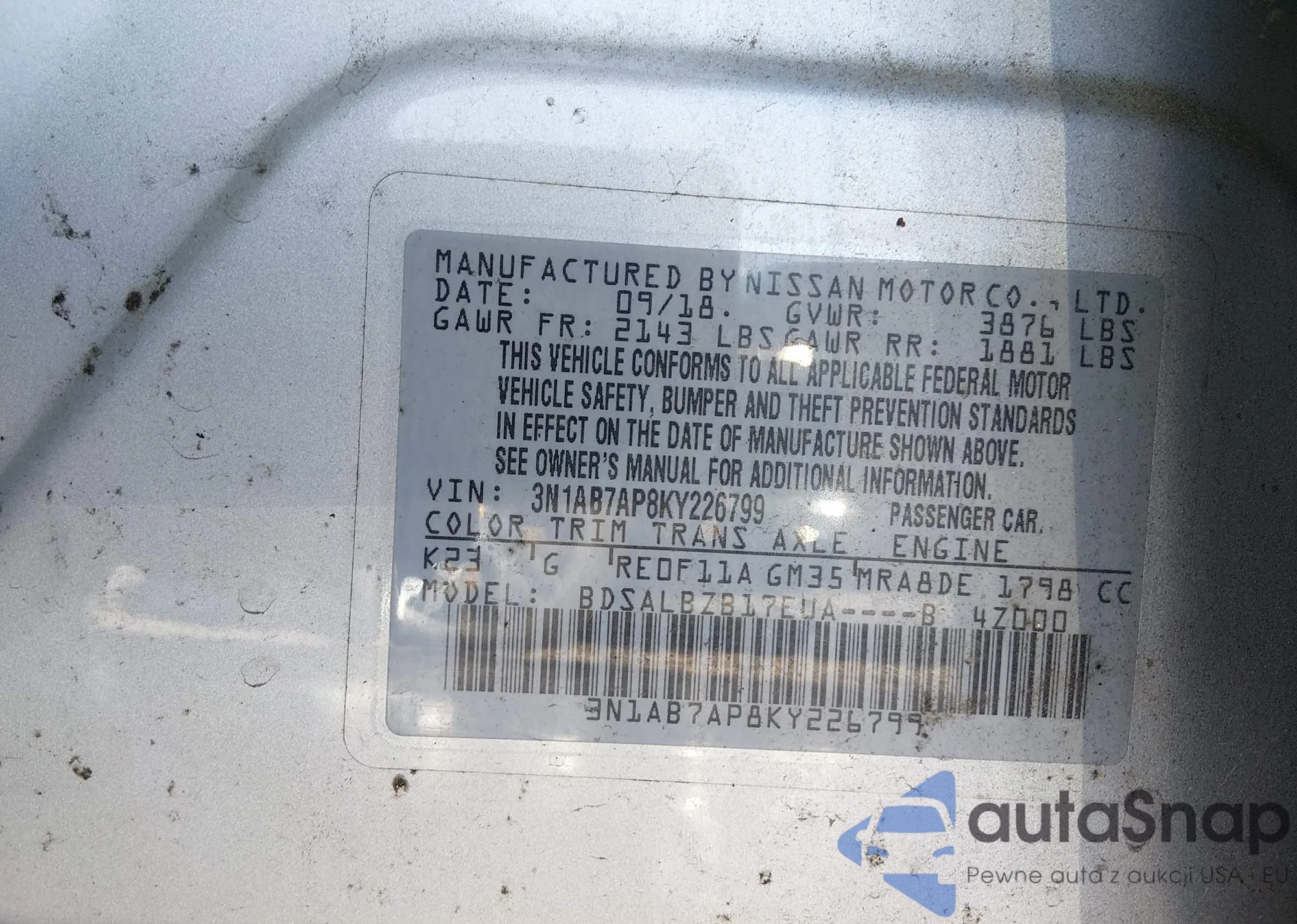 The car Nissan Sentra 2019 (VIN 3N1AB7AP8KY226799) has not been auctioned before. The documents are clean, and the mileage matches or is below the market average. Sold by an insurance company – we recommend purchase. Delivery to the port will take approx. 6–8 weeks.