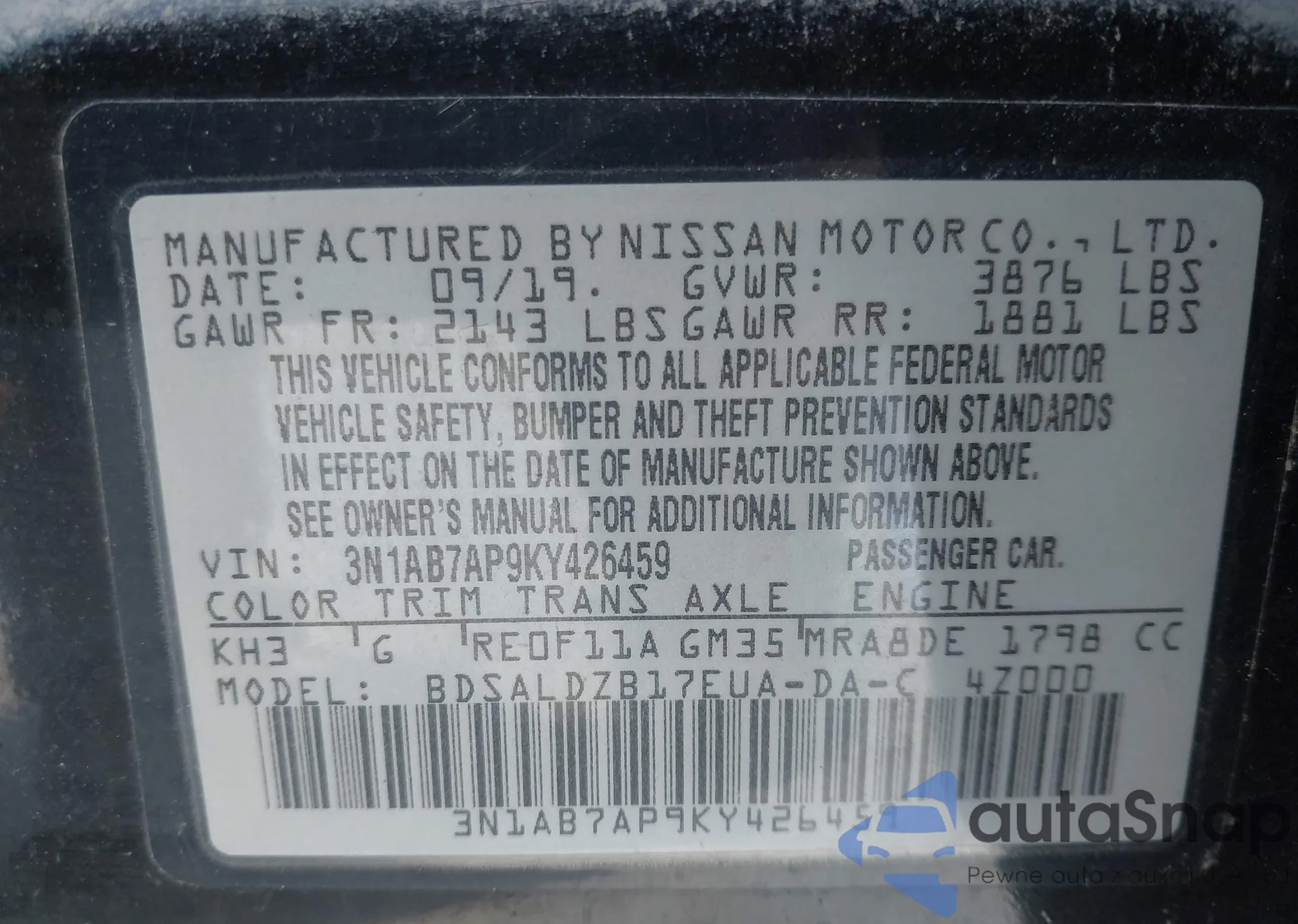 VIN: 3N1AB7AP9KY426459
