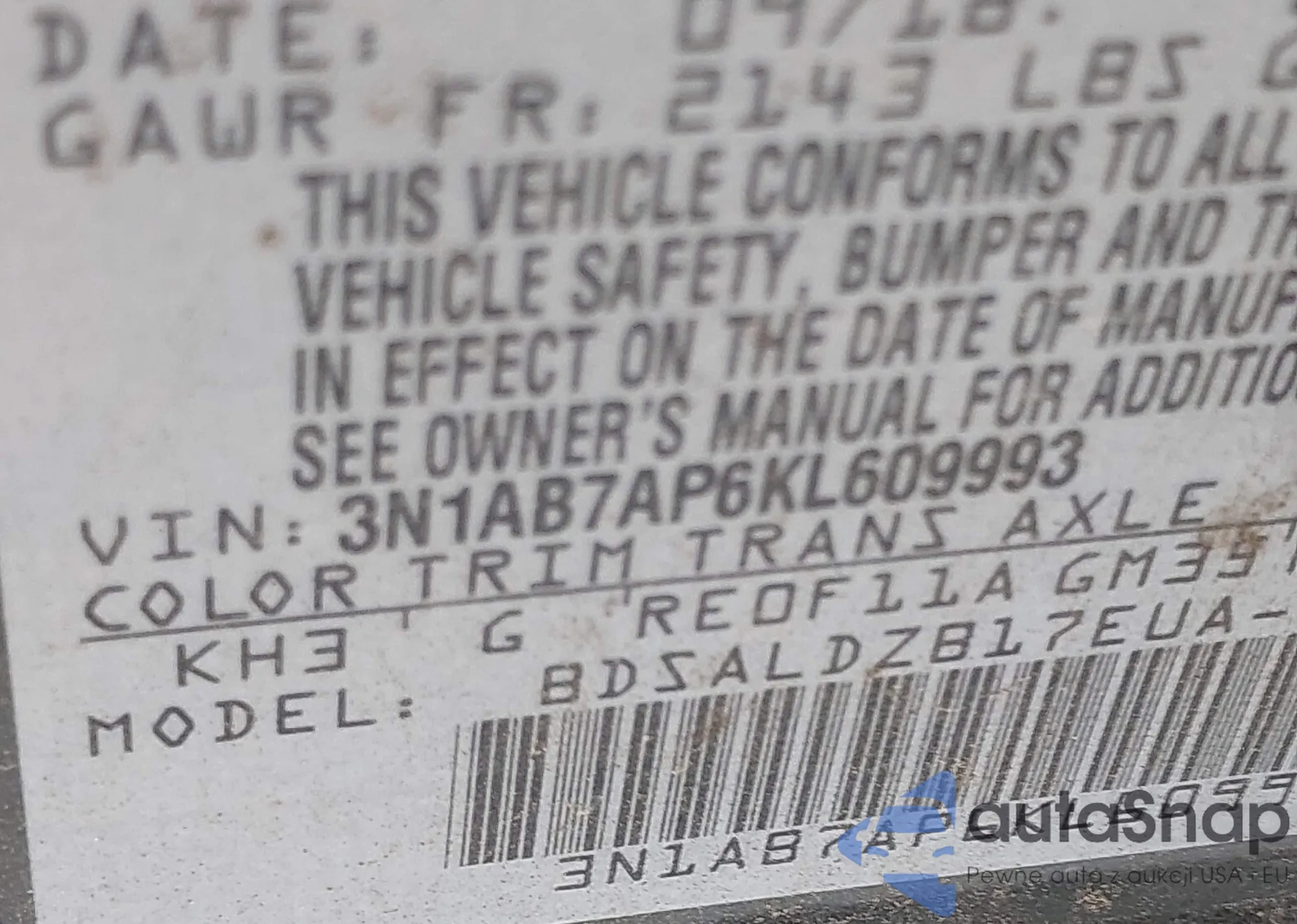 VIN: 3N1AB7AP6KL609993