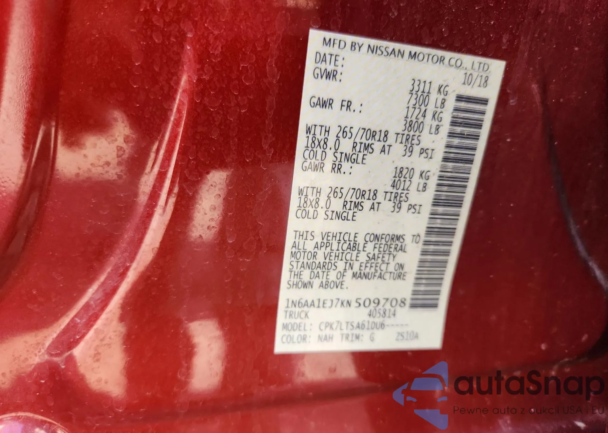The car Nissan Titan 2019 (VIN 1N6AA1EJ7KN509708) is sold by an unverified seller. We recommend checking the Carfax report and confirming registration possibilities before purchase.