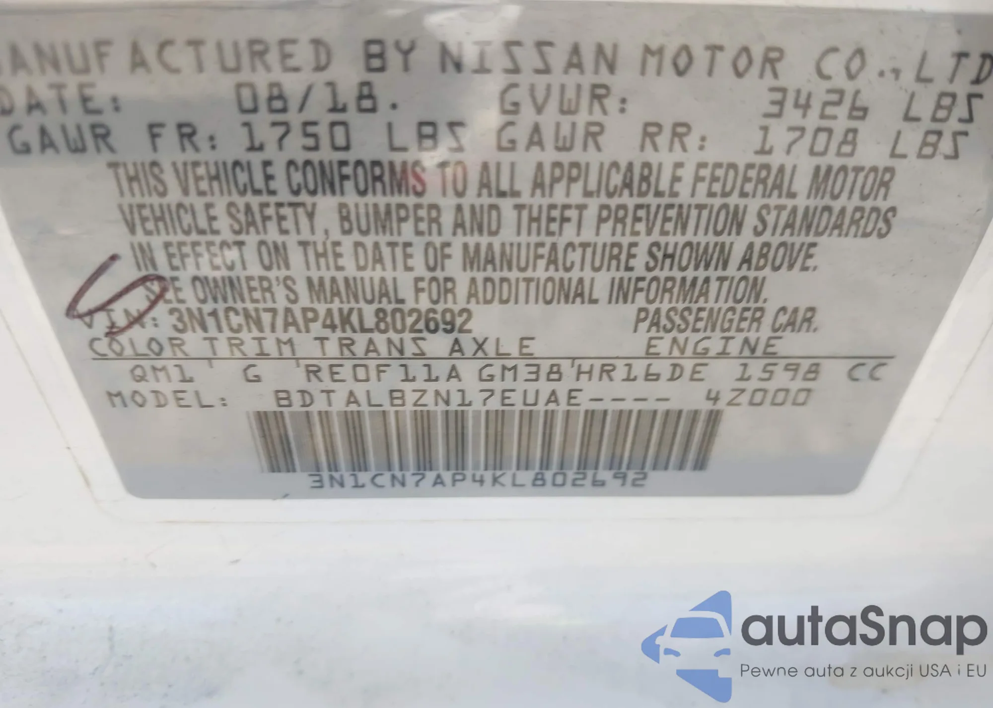 VIN: 3N1CN7AP4KL802692