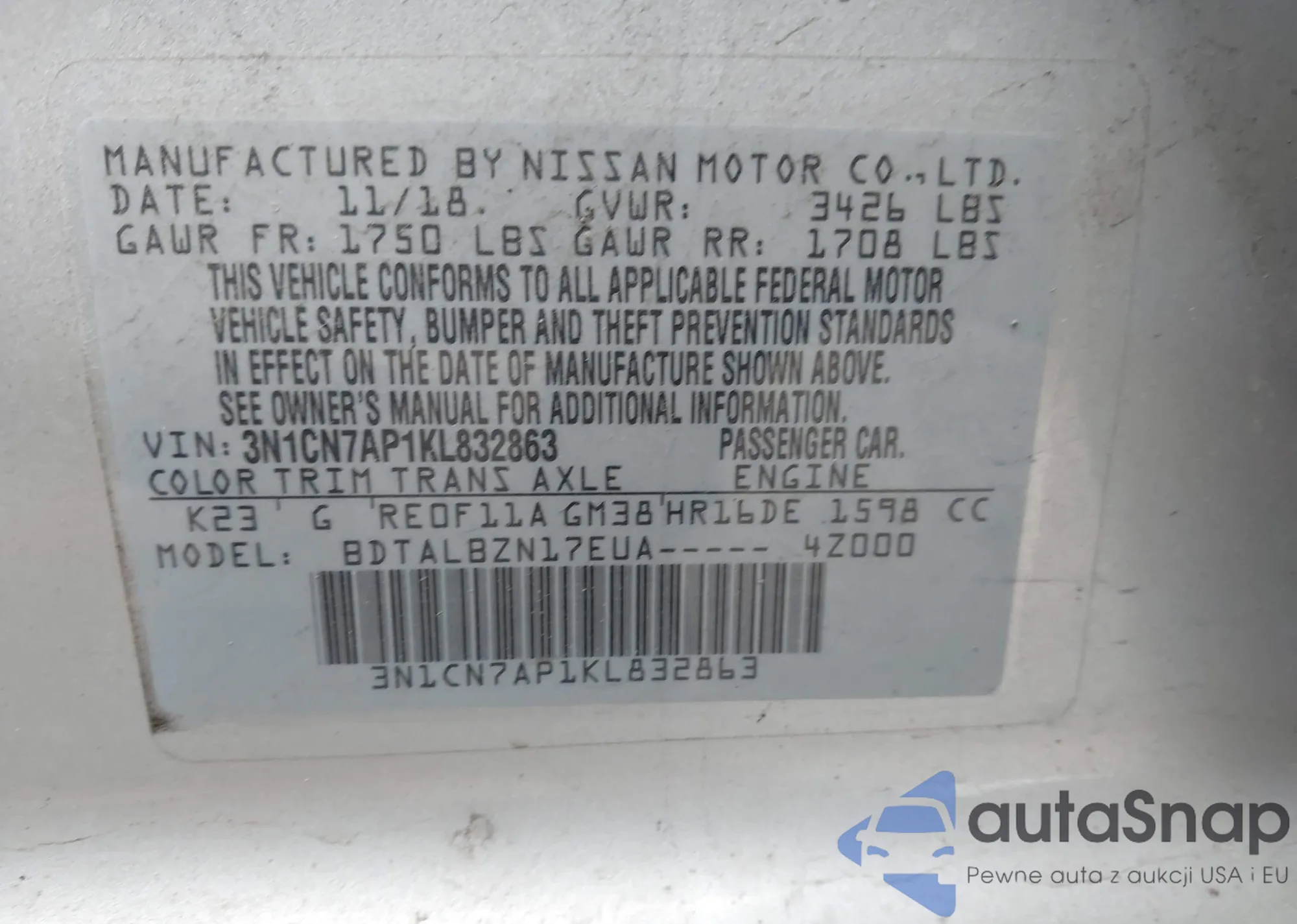 The car Nissan Versa 2019 (VIN 3N1CN7AP1KL832863) has not been auctioned before. The documents are clean, and the mileage matches or is below the market average. Sold by an insurance company – we recommend purchase. Delivery to the port will take approx. 6–8 weeks.
