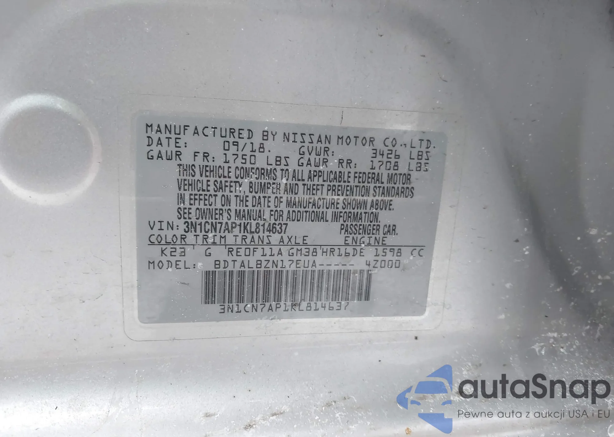 The car Nissan Versa 2019 (VIN 3N1CN7AP1KL814637) has not been auctioned before. The documents are clean, and the mileage matches or is below the market average. Sold by an insurance company – we recommend purchase. Delivery to the port will take approx. 6–8 weeks.