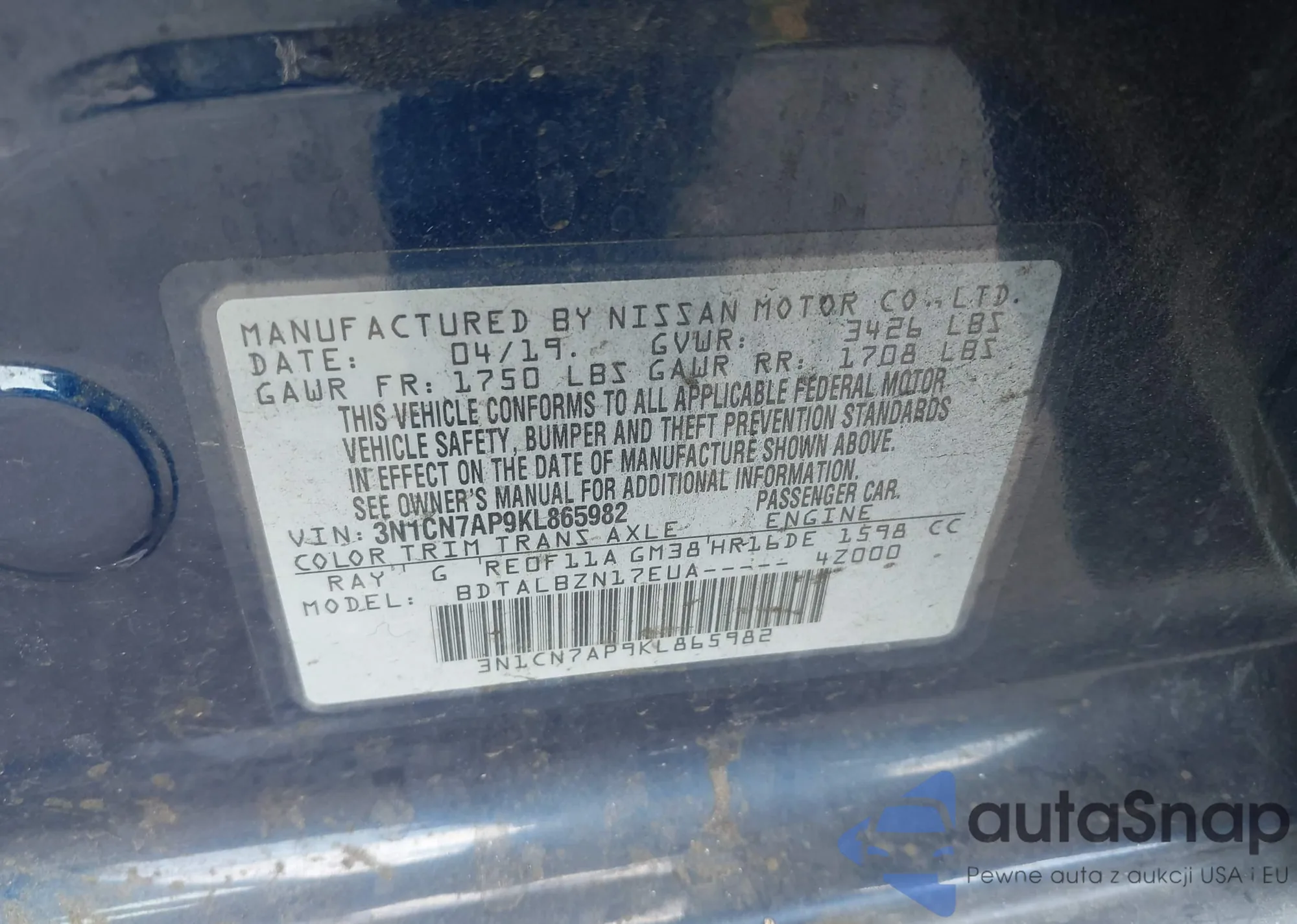 VIN: 3N1CN7AP9KL865982