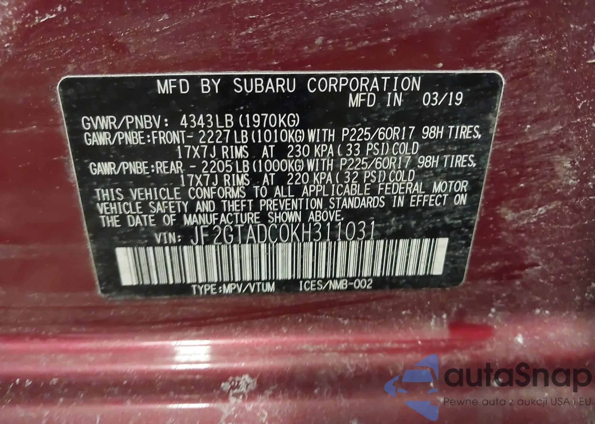• VIN: JF2GTADC0KH311031