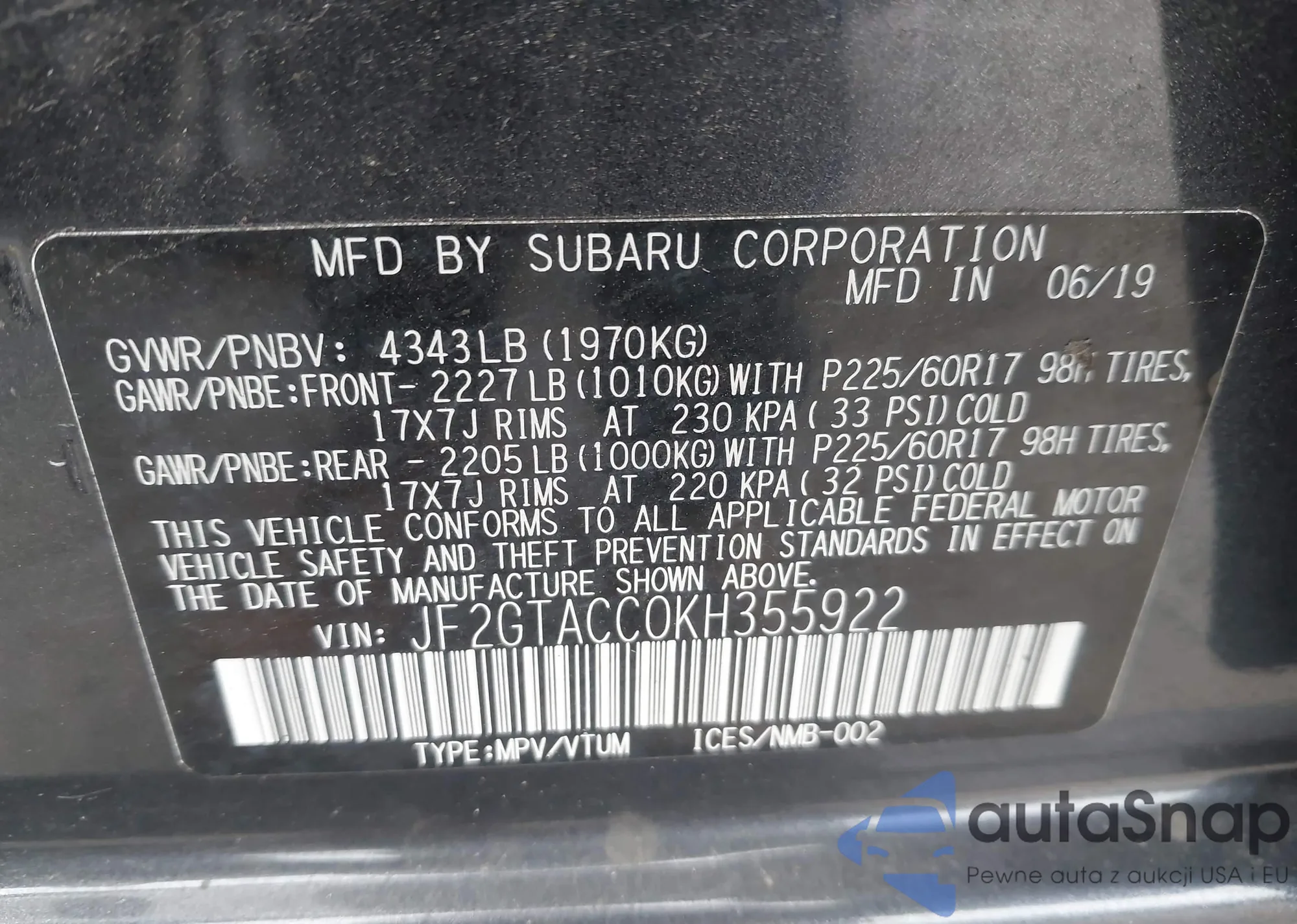 VIN: JF2GTACC0KH355922