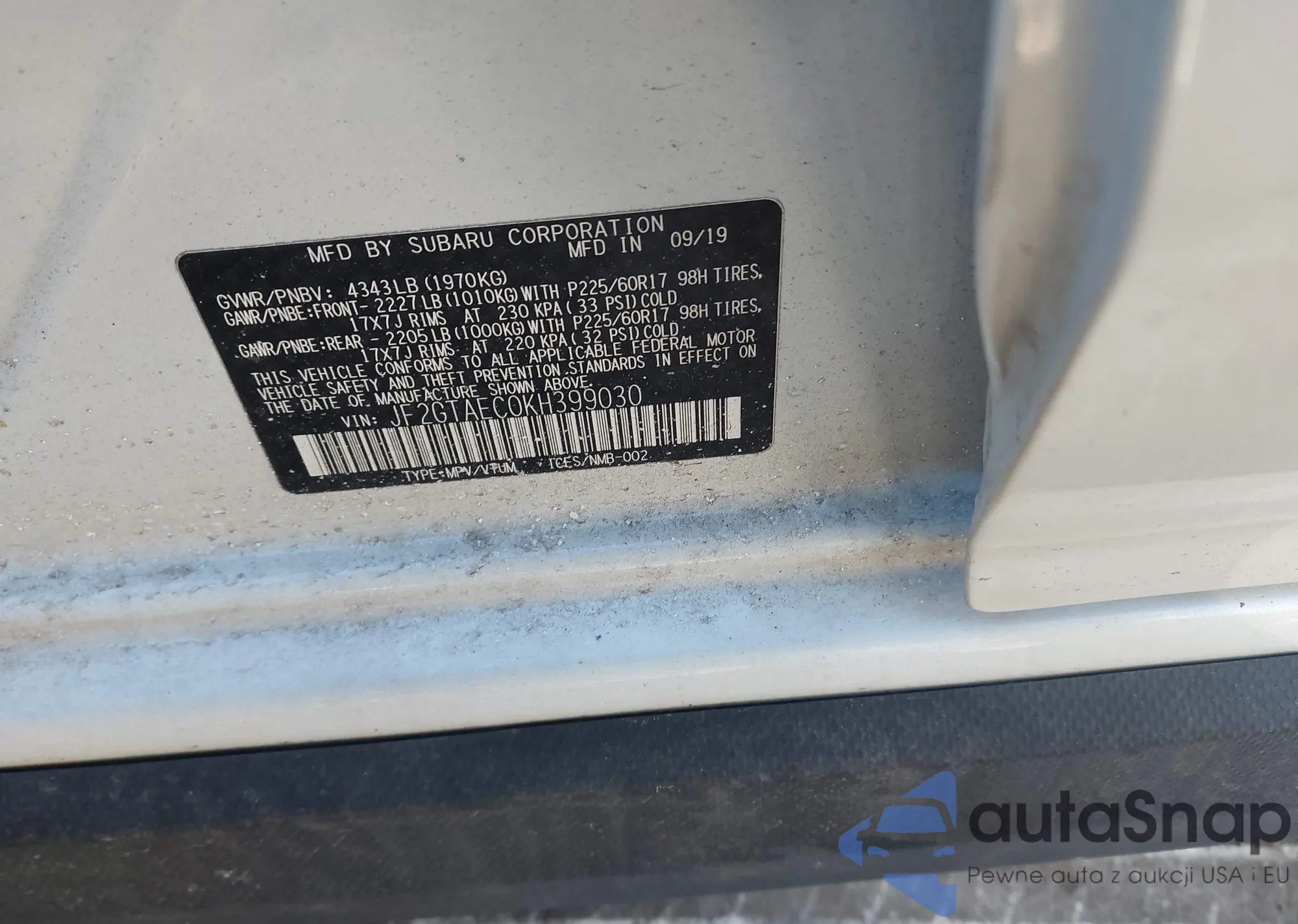 • VIN: JF2GTAEC0KH399030
