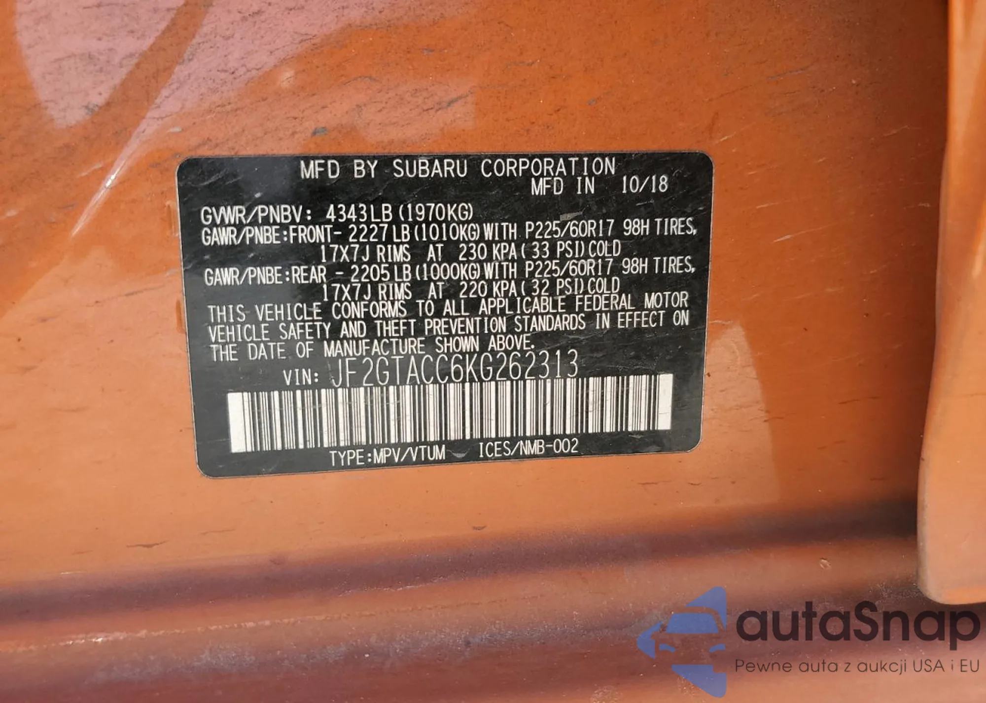 VIN: JF2GTACC6KG262313