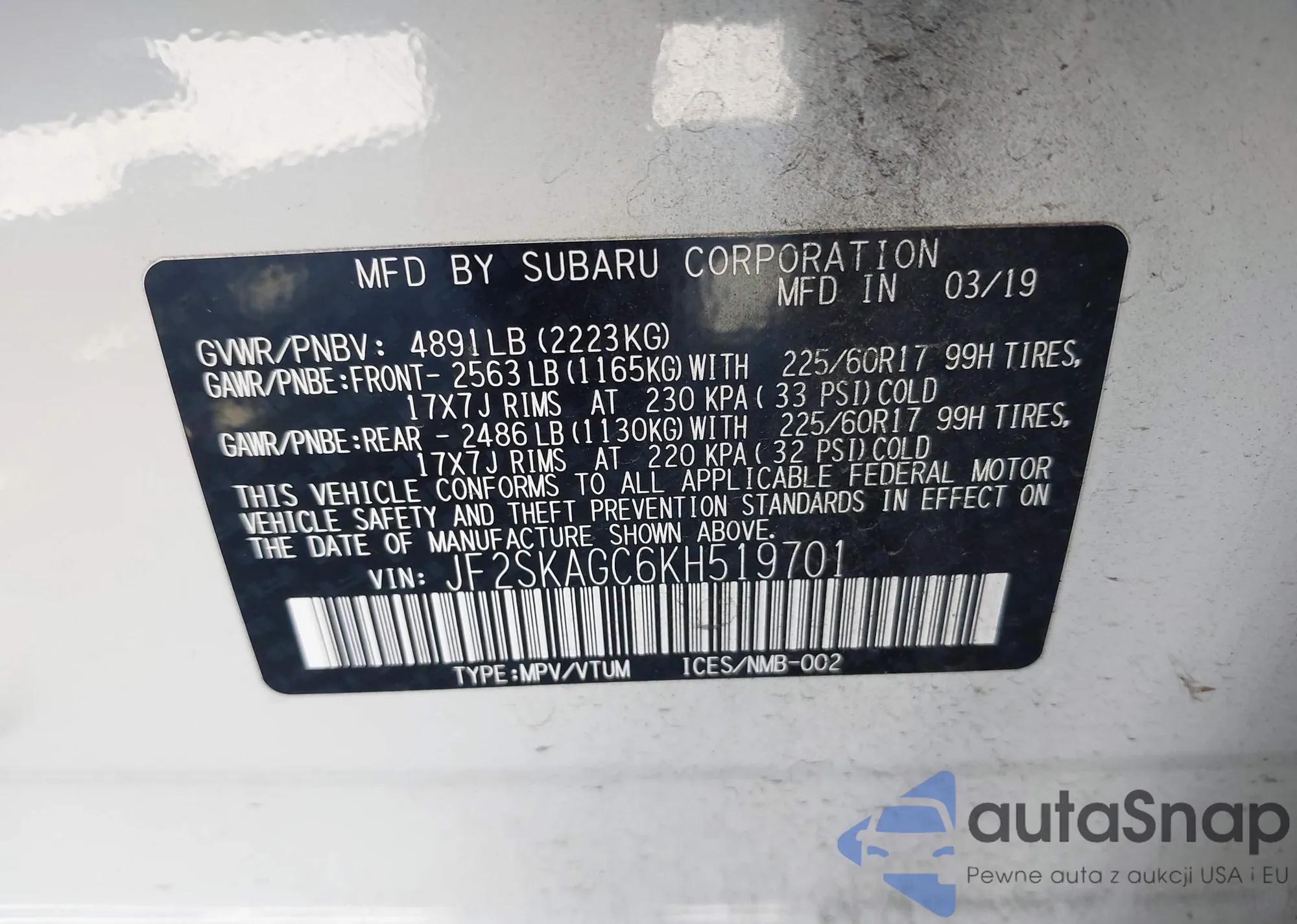 VIN: JF2SKAGC6KH519701