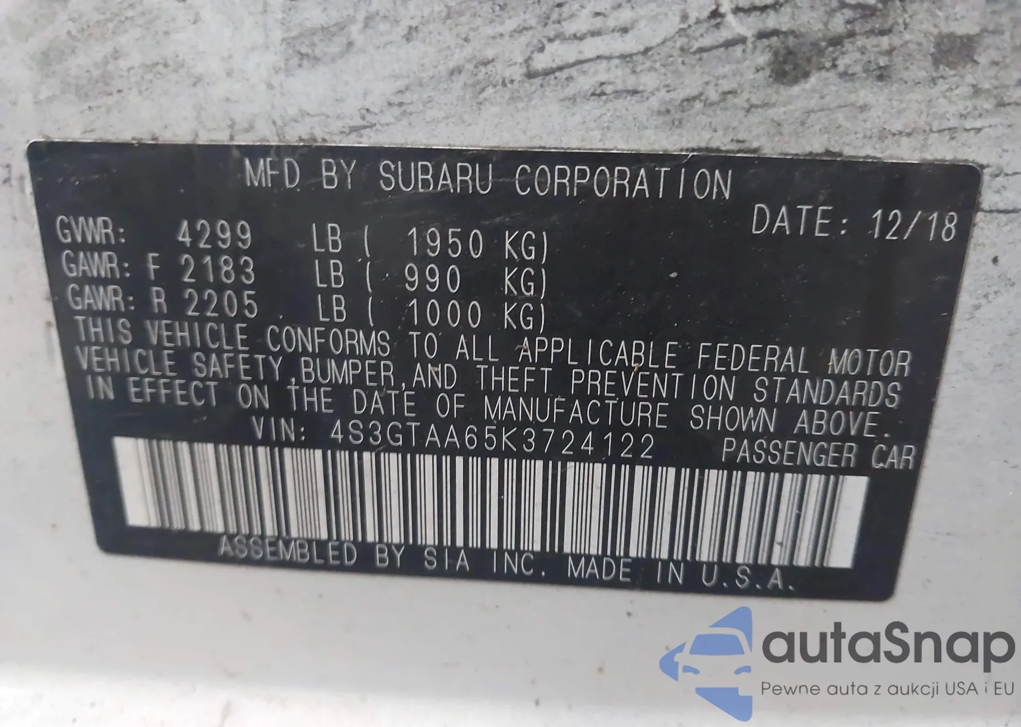 The car Subaru Impreza 2019 (VIN 4S3GTAA65K3724122) has documents that prevent registration. Export and registration may be difficult. Contact AutaSnap experts to find alternatives.