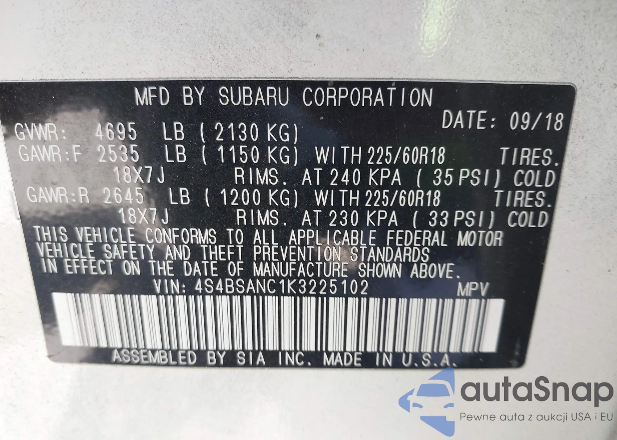 VIN: 4S4BSANC1K3225102