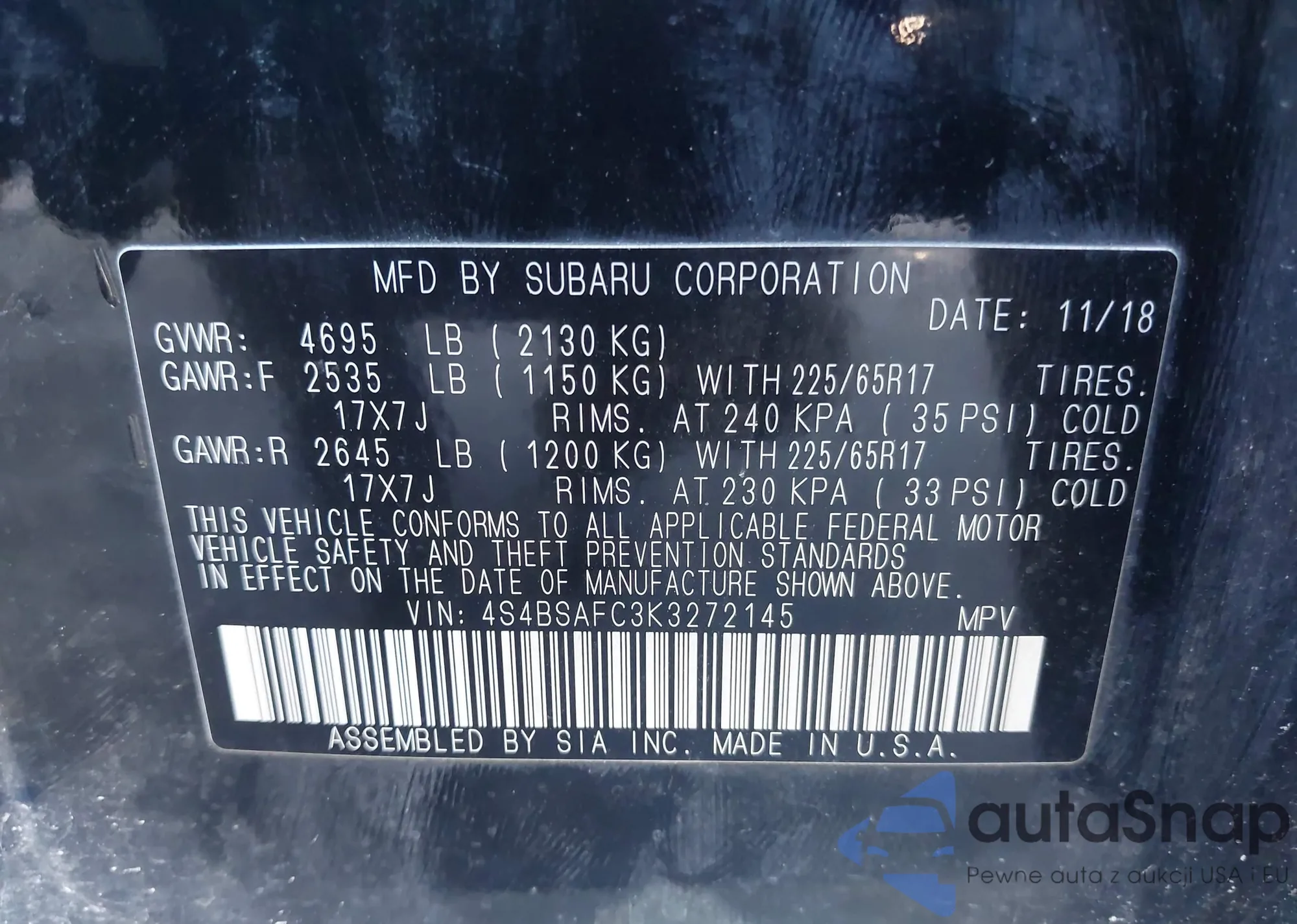 VIN: 4S4BSAFC3K3272145
