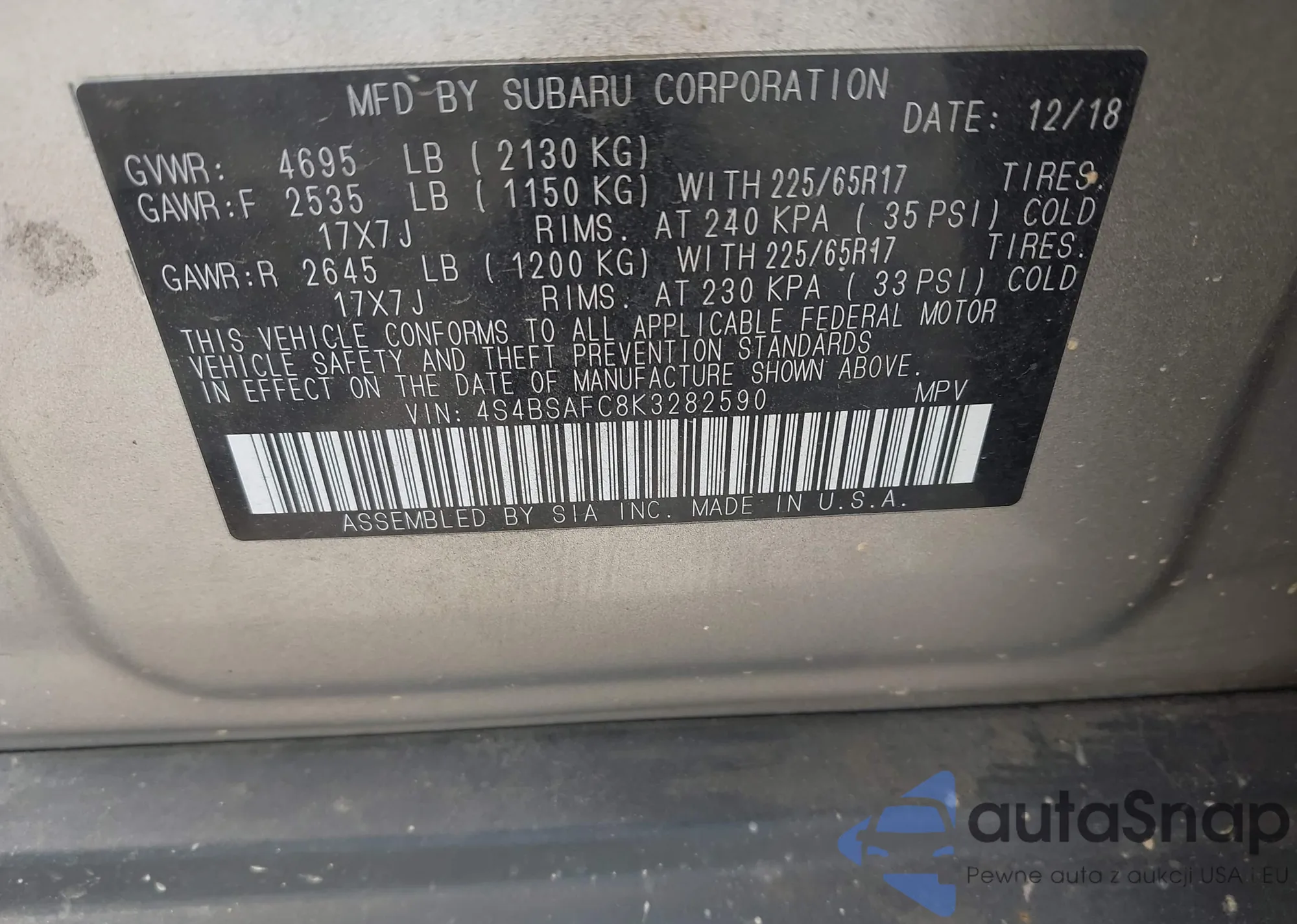 VIN: 4S4BSAFC8K3282590