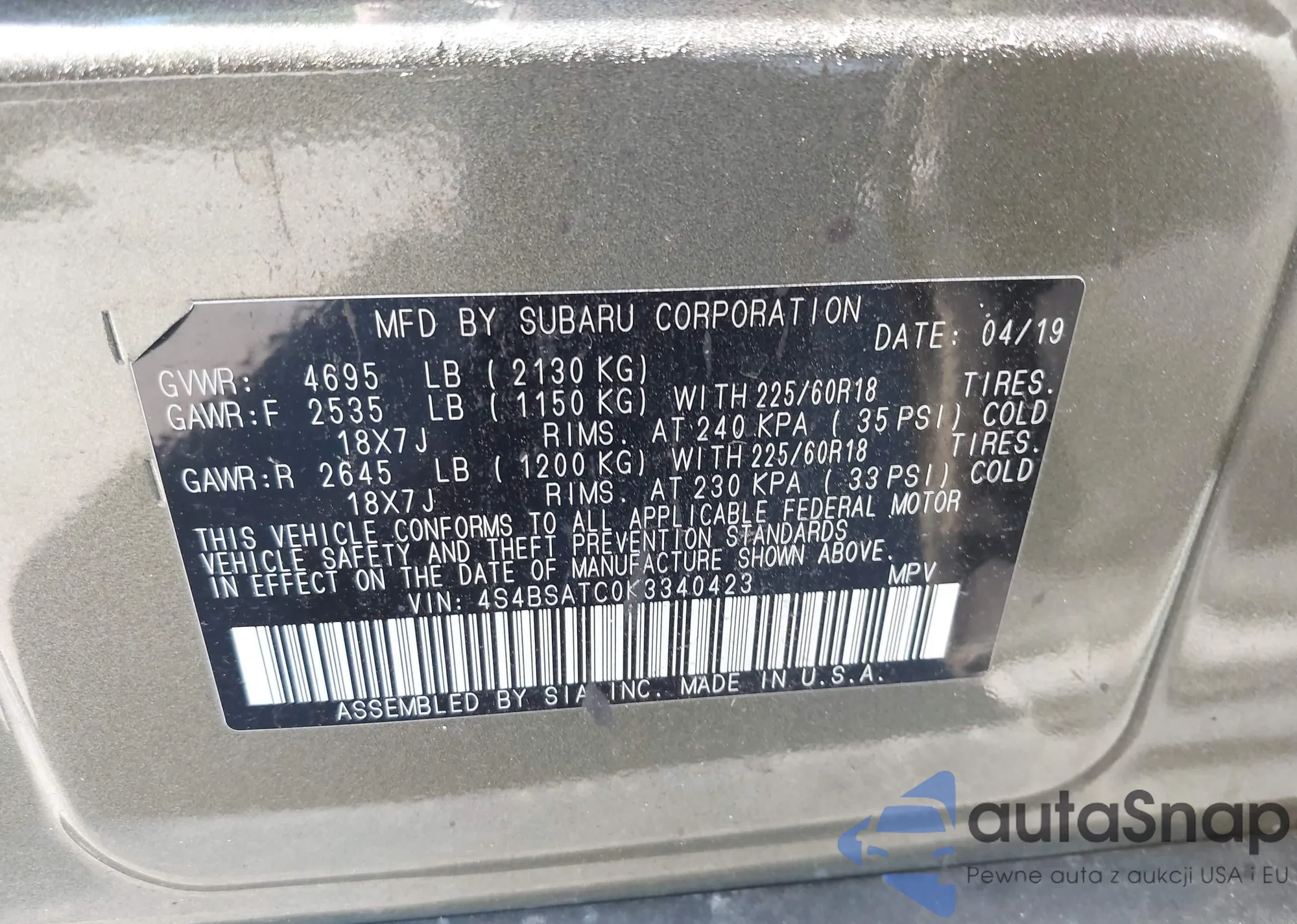 The car Subaru Outback 2019 (VIN 4S4BSATC0K3340423) has not been auctioned before. The documents are clean, and the mileage matches or is below the market average. Sold by an insurance company – we recommend purchase. Delivery to the port will take approx. 6–8 weeks.