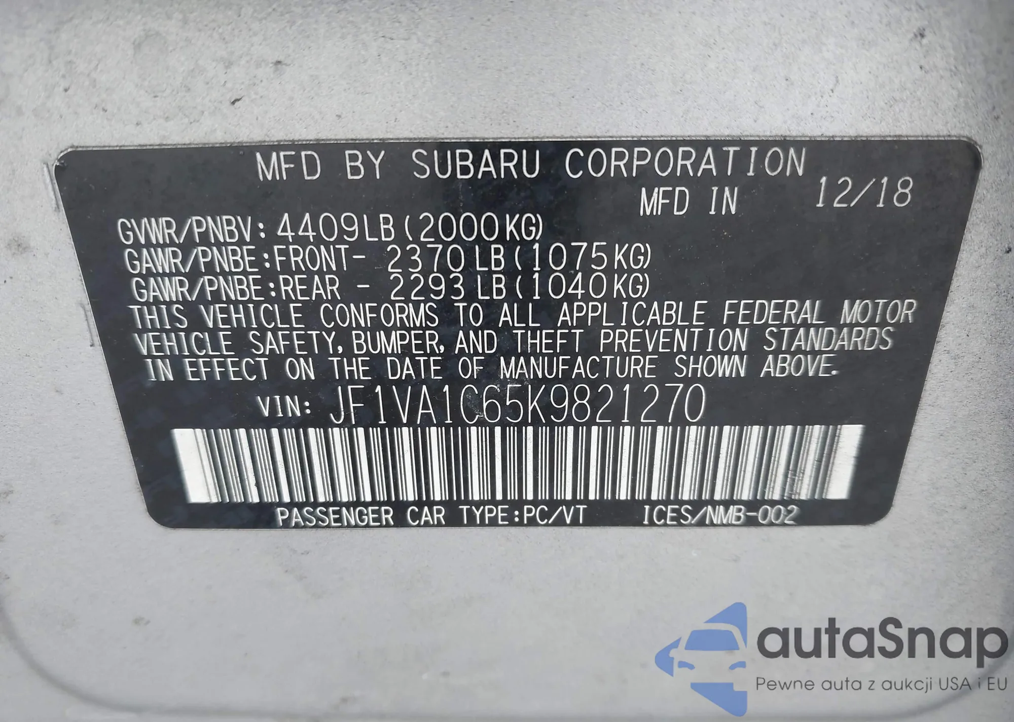 The car Subaru WRX 2019 (VIN JF1VA1C65K9821270) has not been auctioned before. The documents are clean, and the mileage matches or is below the market average. Sold by an insurance company – we recommend purchase. Delivery to the port will take approx. 6–8 weeks.