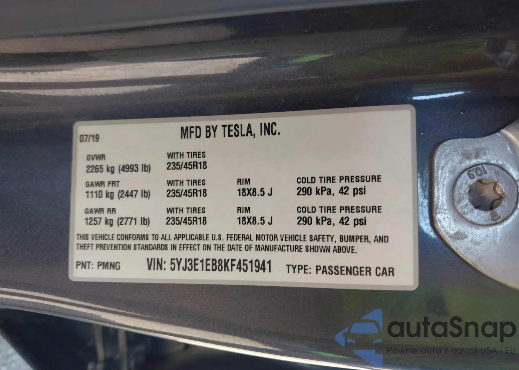 VIN: 5YJ3E1EB8KF451941