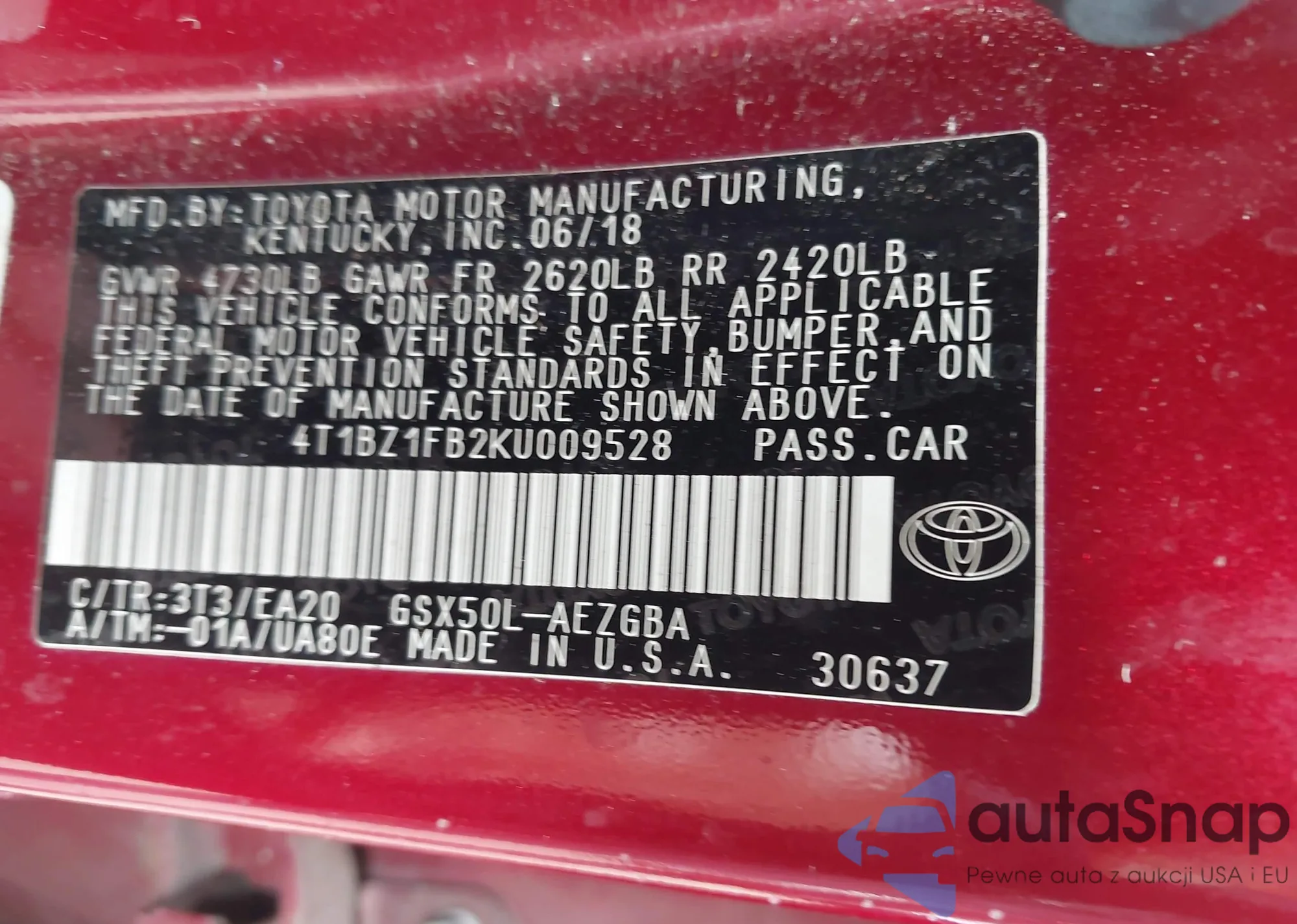 • VIN: 4T1BZ1FB2KU009528