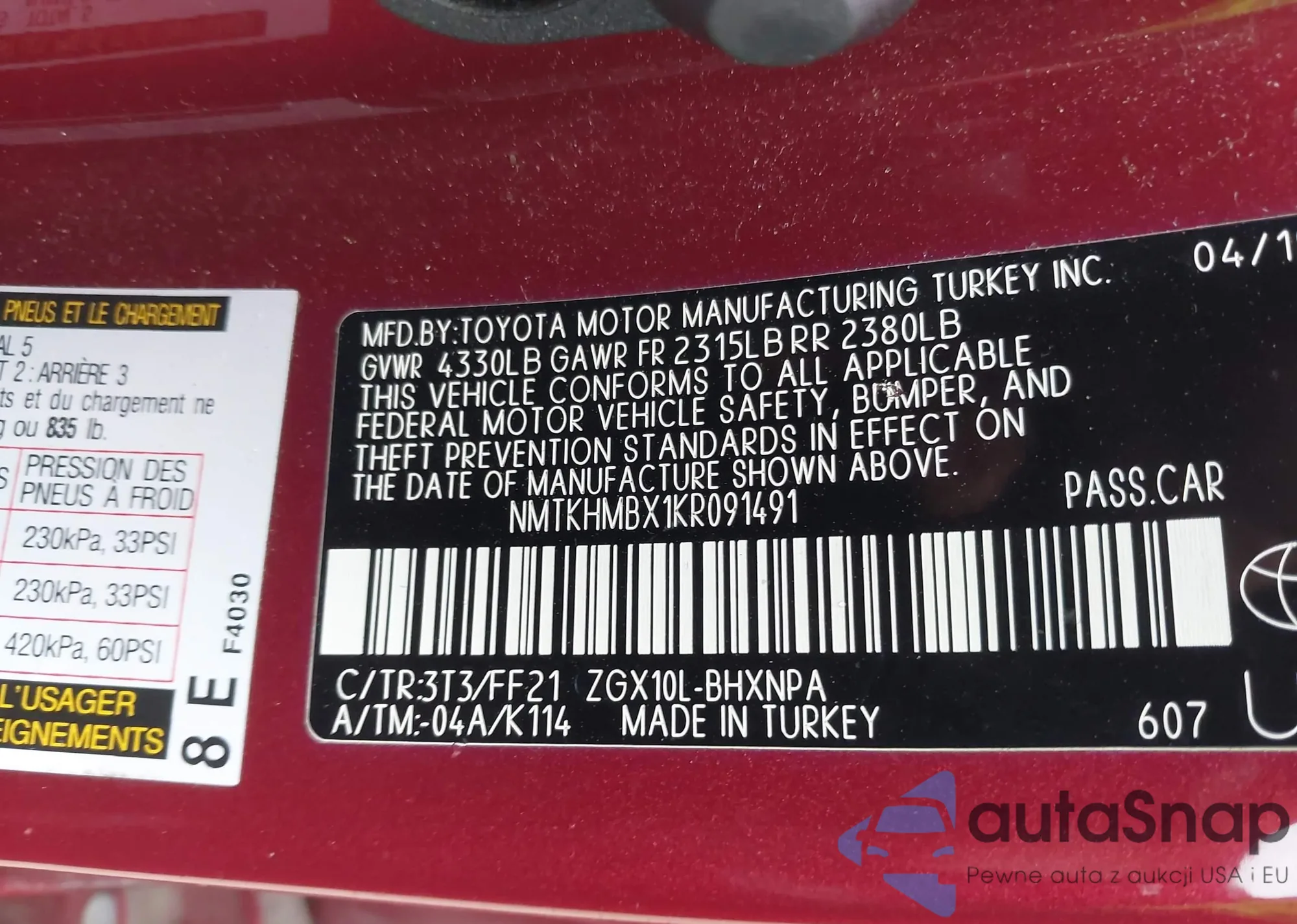VIN: NMTKHMBX1KR091491