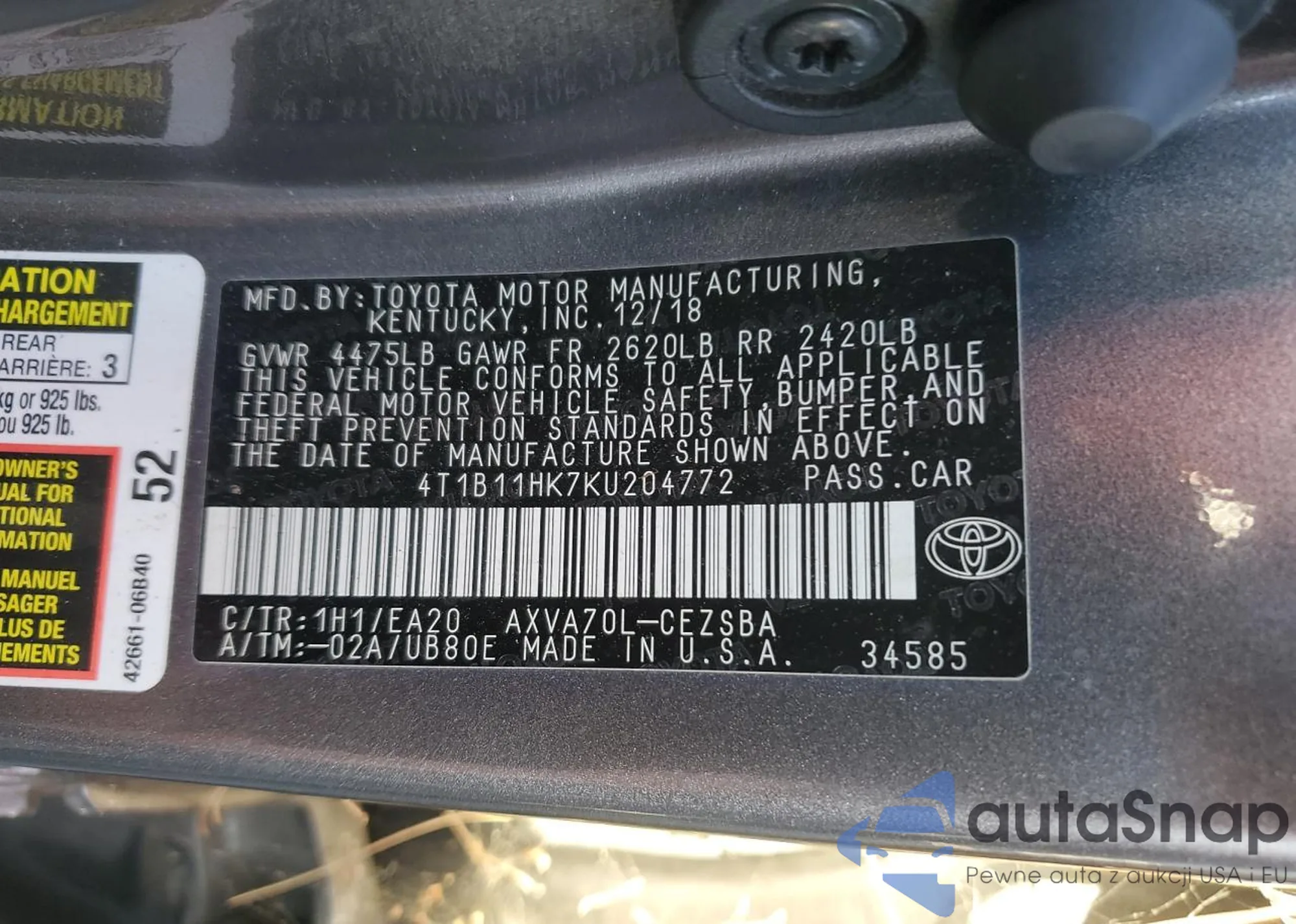 VIN: 4T1B11HK7KU204772