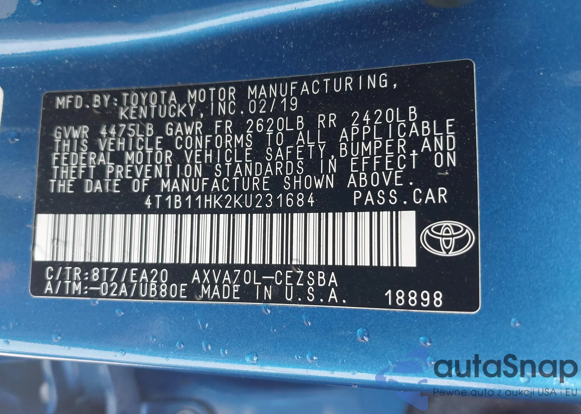 VIN: 4T1B11HK2KU231684