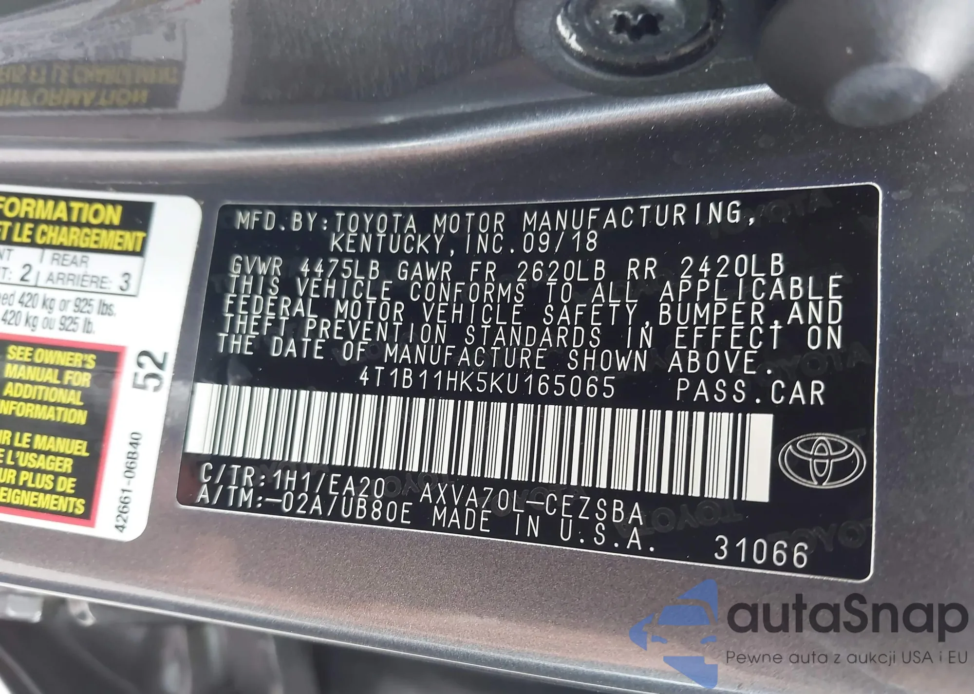 VIN: 4T1B11HK5KU165065