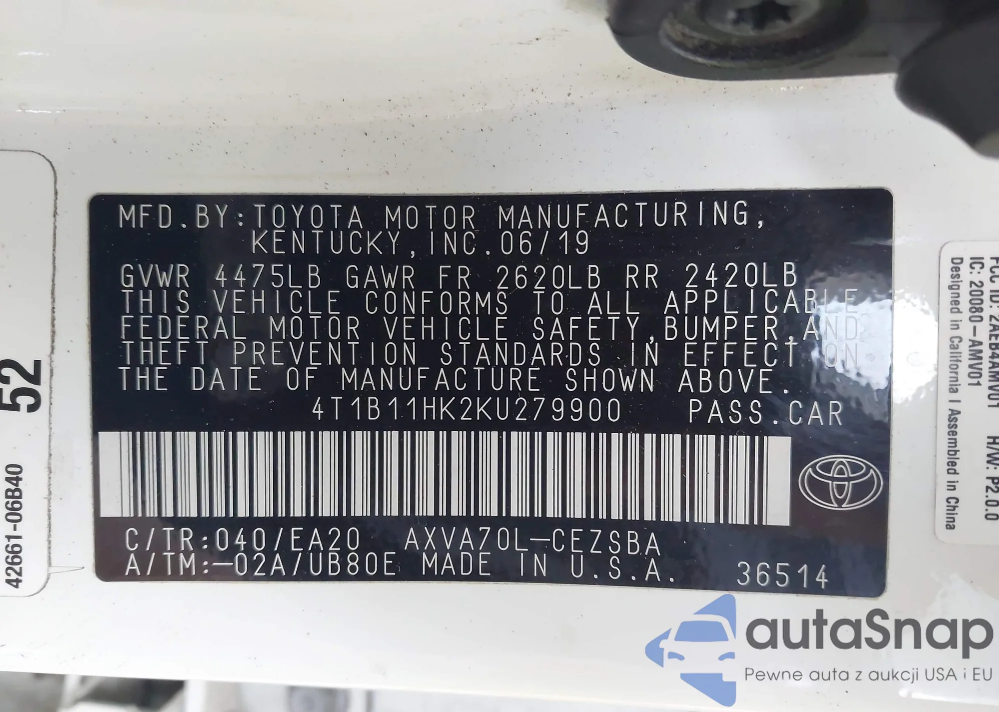 VIN: 4T1B11HK2KU279900