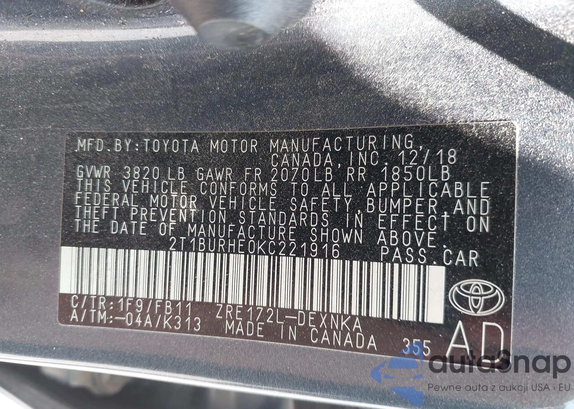 VIN: 2T1BURHE0KC221916