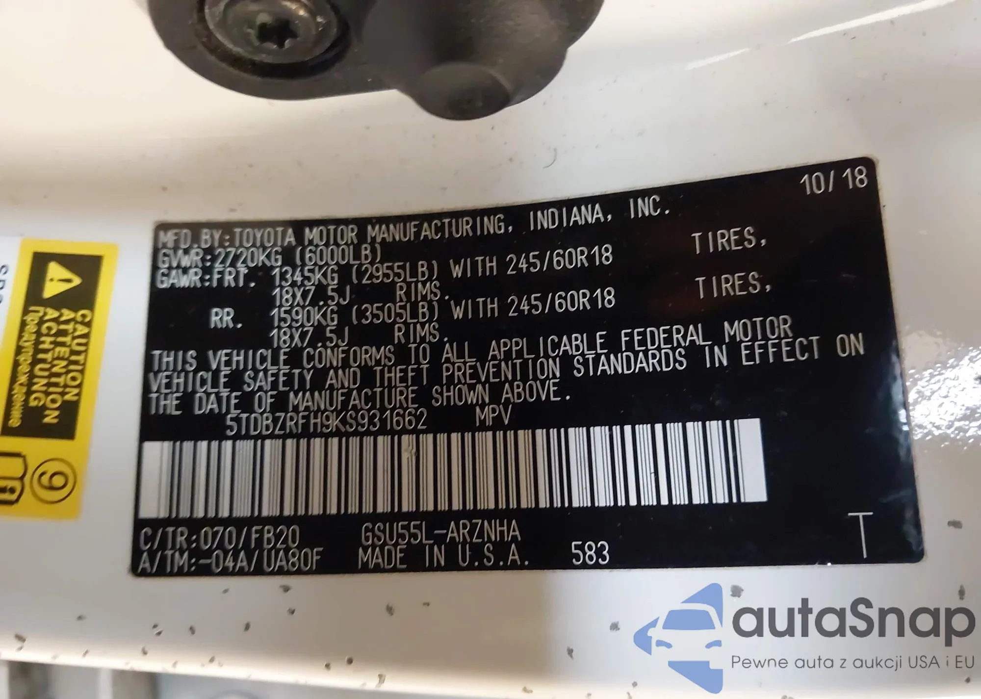 • VIN: 5TDBZRFH9KS931662