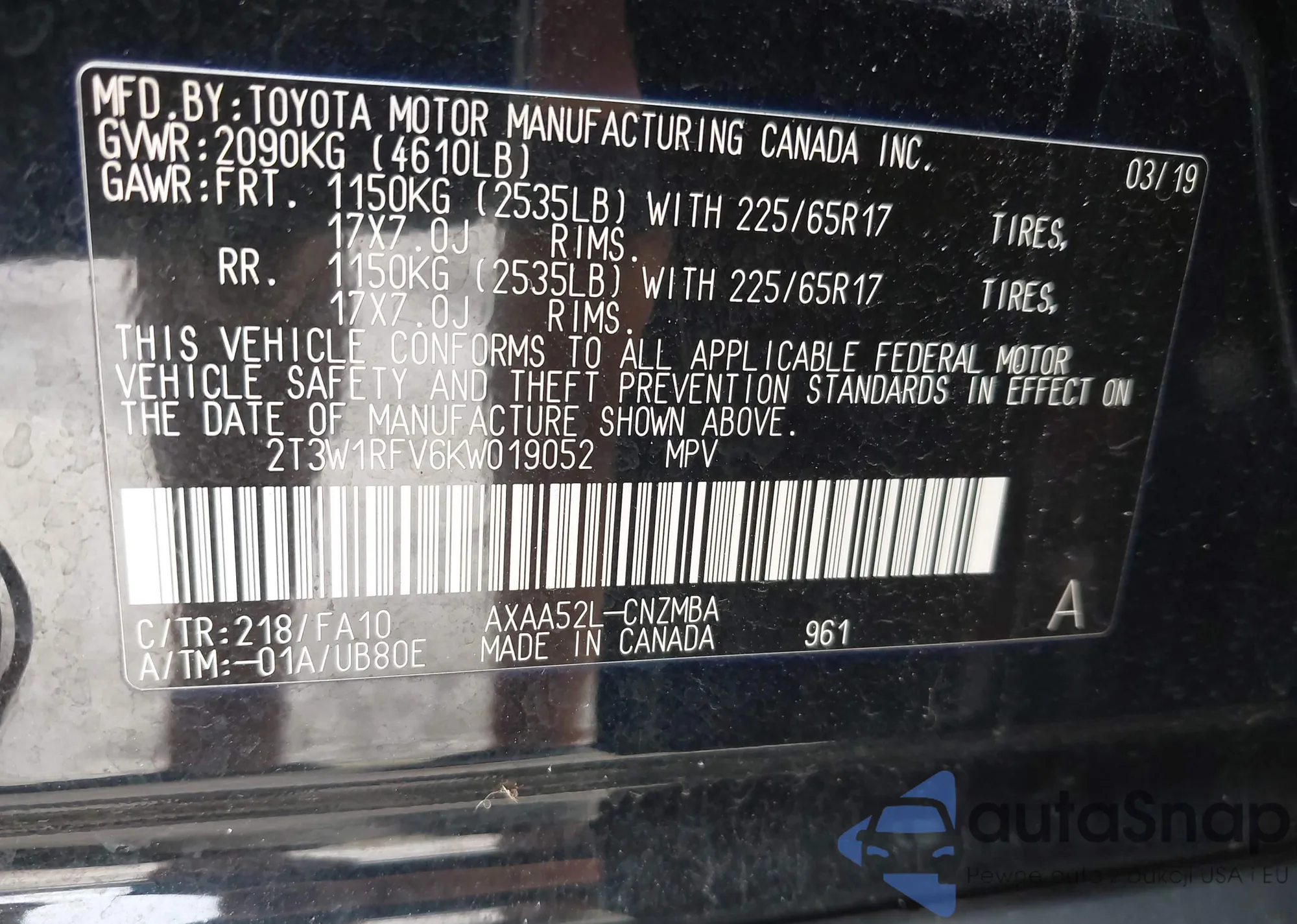 VIN: 2T3W1RFV6KW019052