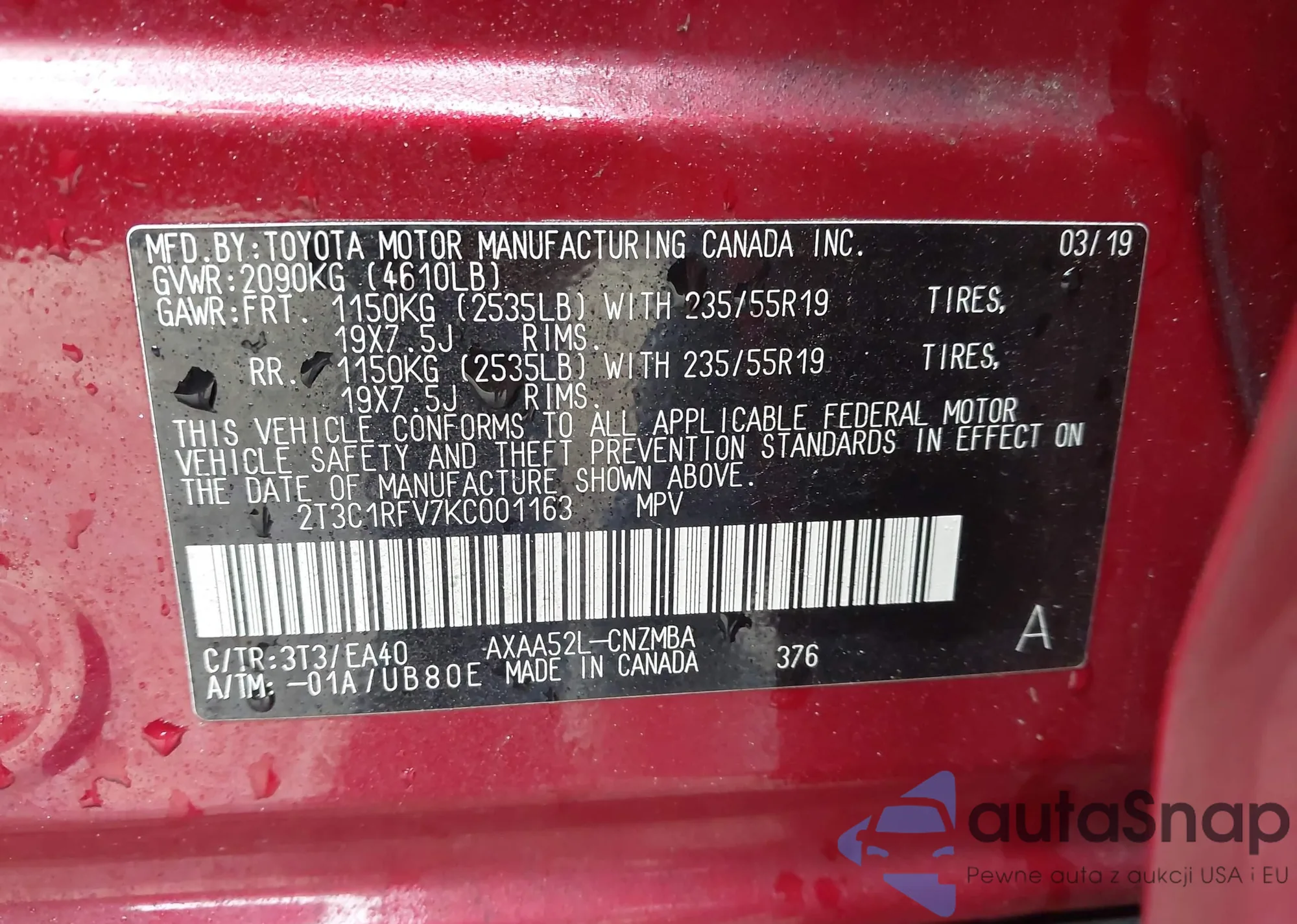 VIN: 2T3C1RFV7KC001163