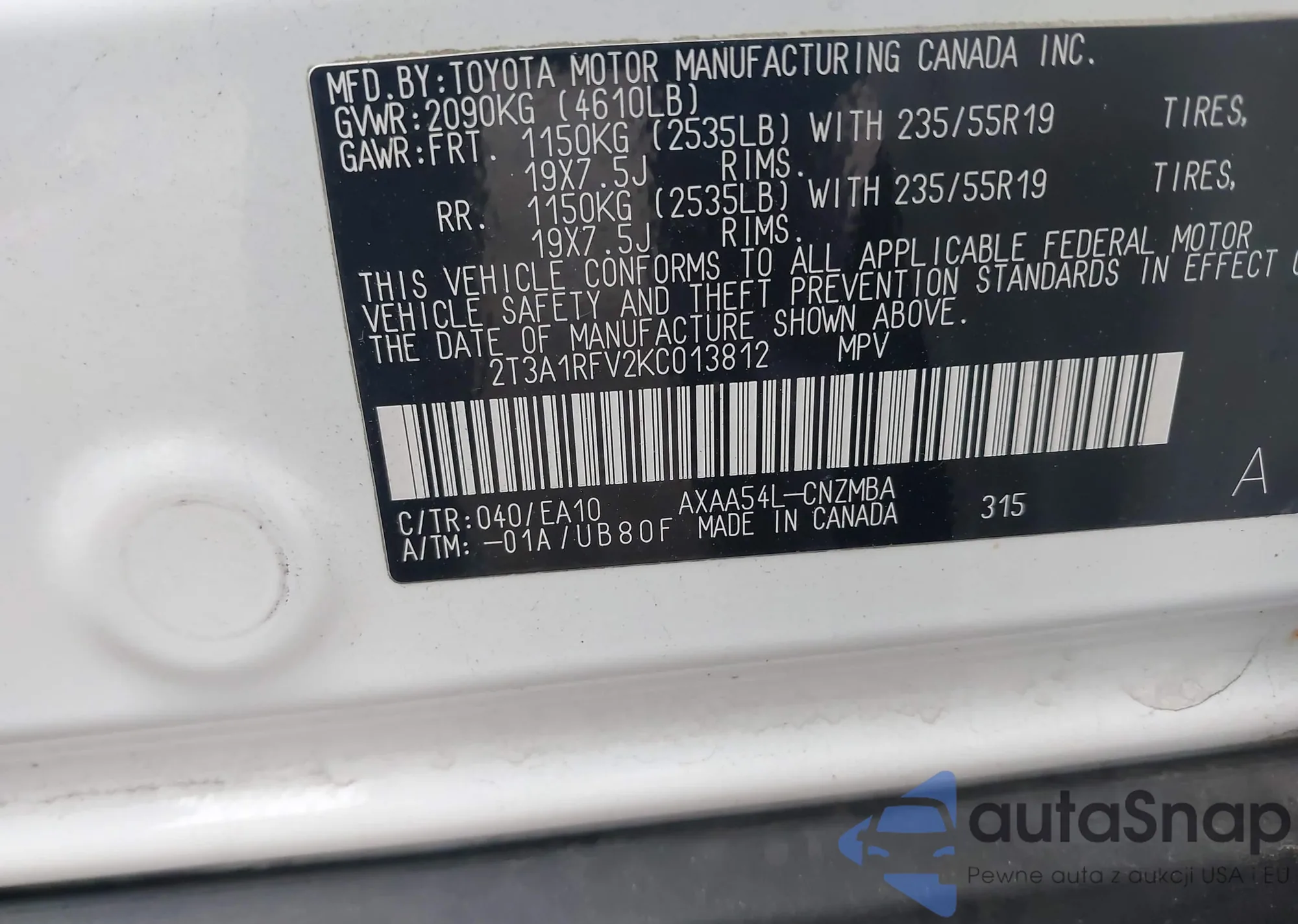 VIN: 2T3A1RFV2KC013812