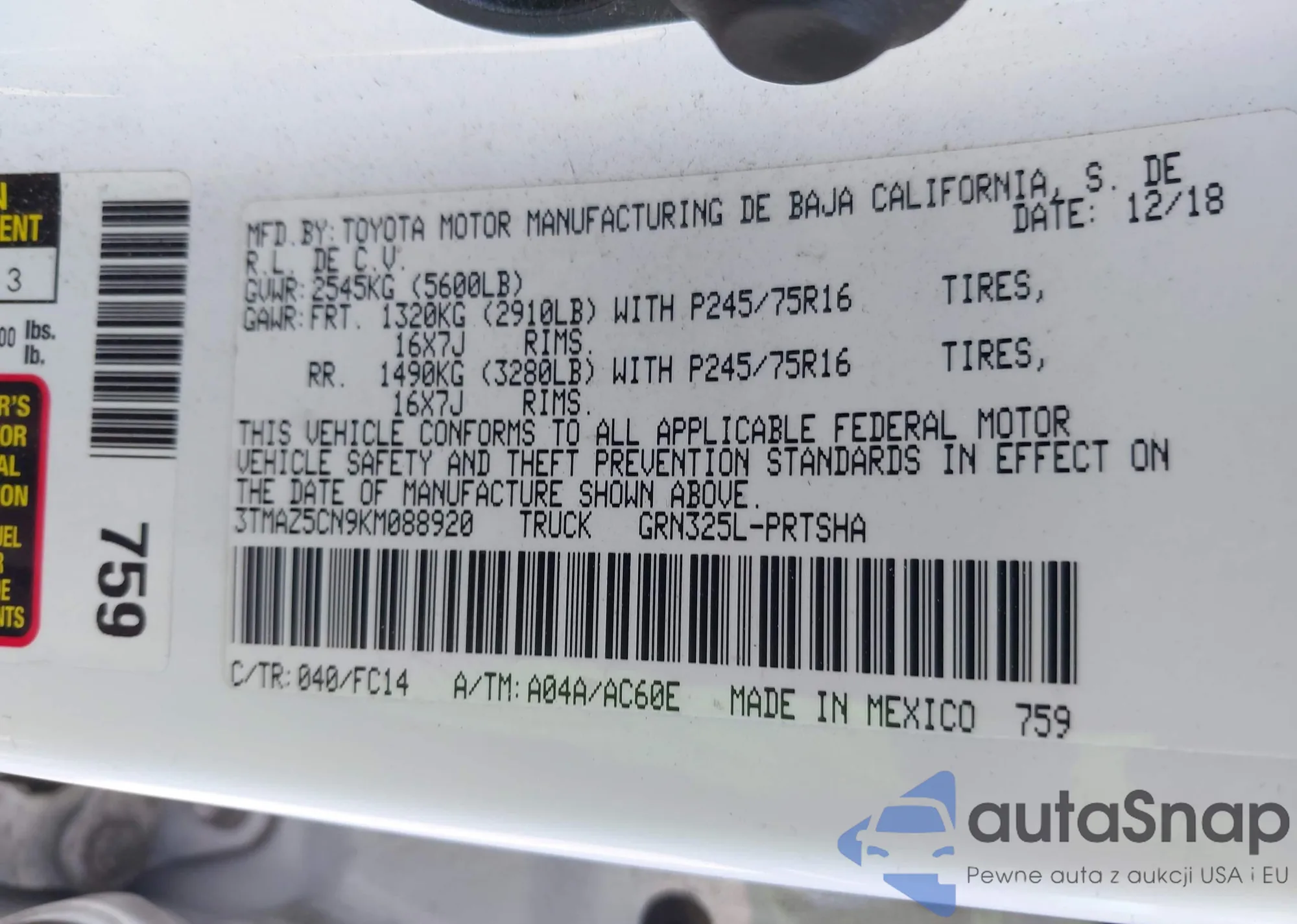 VIN: 3TMAZ5CN9KM088920