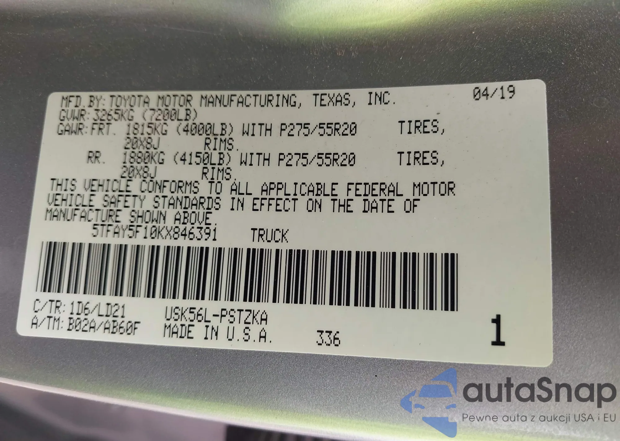 • VIN: 5TFAY5F10KX846391