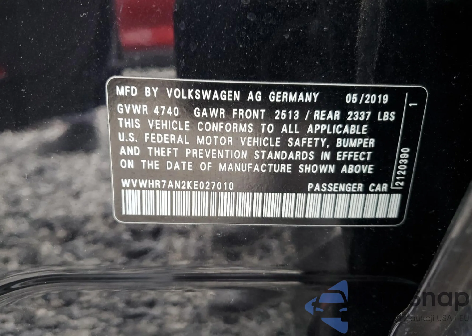 The car Volkswagen Arteon 2019 (VIN WVWHR7AN2KE027010) has documents that prevent registration. Export and registration may be difficult. Contact AutaSnap experts to find alternatives.