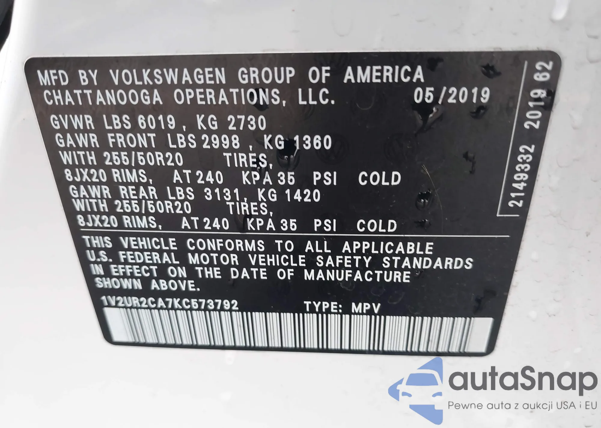 VIN: 1V2UR2CA7KC573792