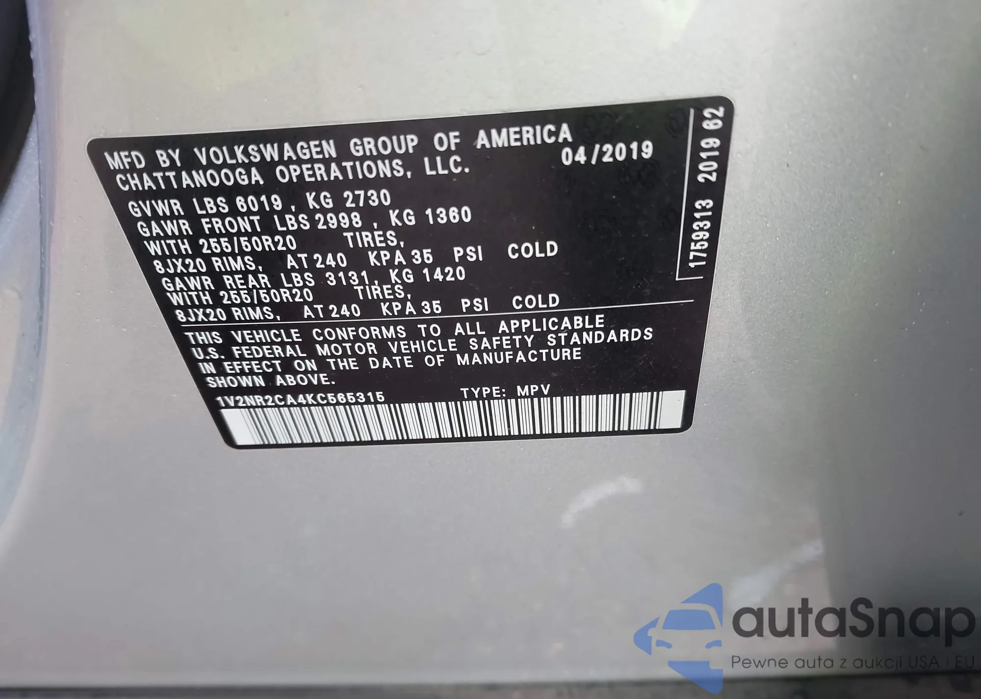 VIN: 1V2NR2CA4KC565315
