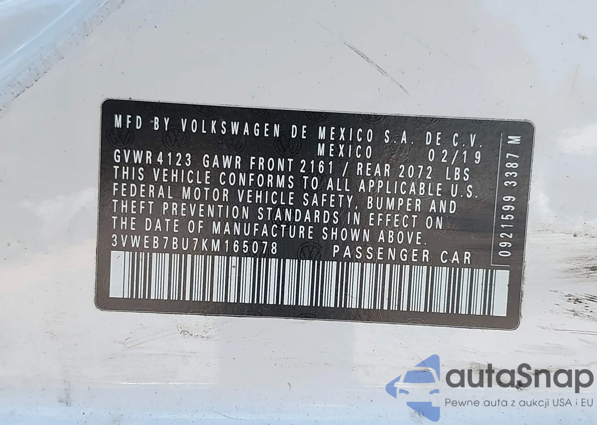 • VIN: 3VWEB7BU7KM165078