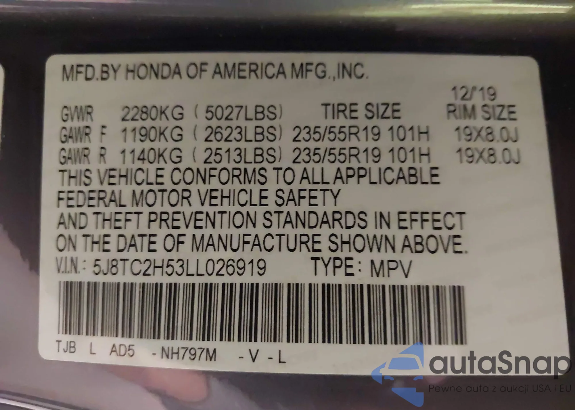 VIN: 5J8TC2H53LL026919