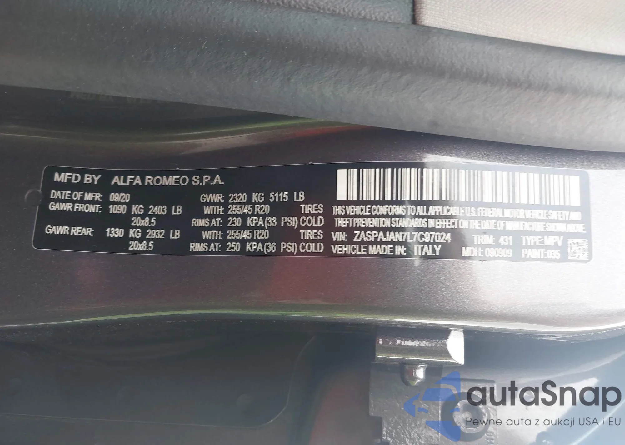 The car Alfa Romeo Stelvio 2020 (VIN ZASPAJAN7L7C97024) has not been auctioned before. The documents are clean, and the mileage matches or is below the market average. Sold by an insurance company – we recommend purchase. Delivery to the port will take approx. 6–8 weeks.