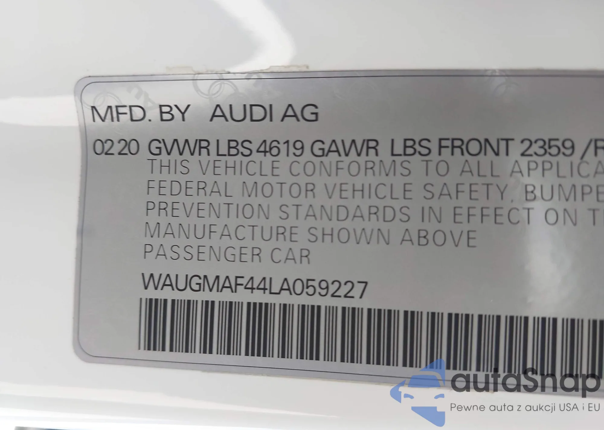 The car Audi A4 2020 (VIN WAUGMAF44LA059227) has not been auctioned before. The documents are clean, and the mileage matches or is below the market average. Sold by an insurance company – we recommend purchase. Delivery to the port will take approx. 6–8 weeks.