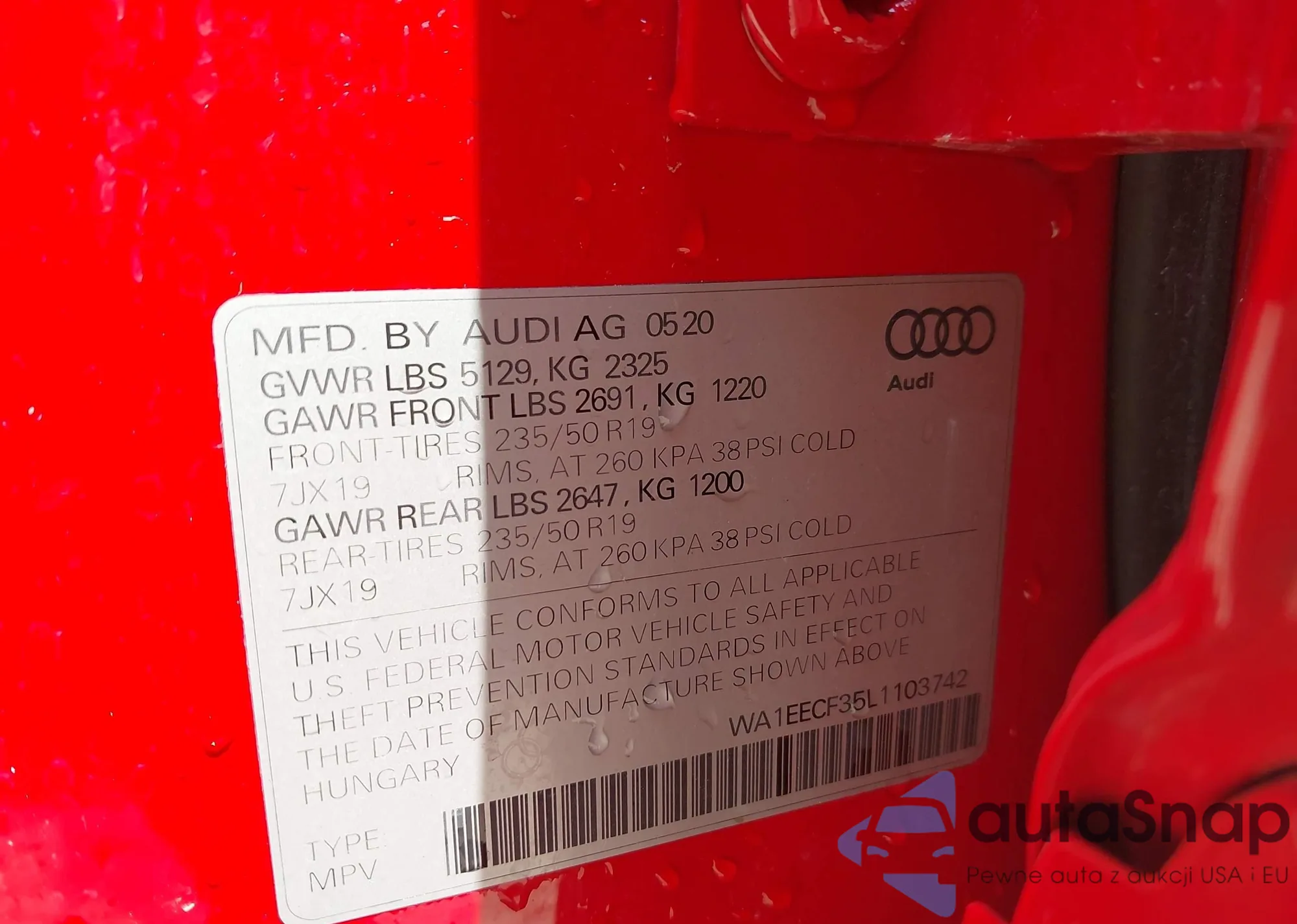 The car Audi Q3 2020 (VIN WA1EECF35L1103742) has not been auctioned before (0 auctions). The documents are clean, and the mileage matches or is below the market average. Sold by an insurance company – we recommend purchase. Delivery to the port will take approx. 6–8 weeks.
