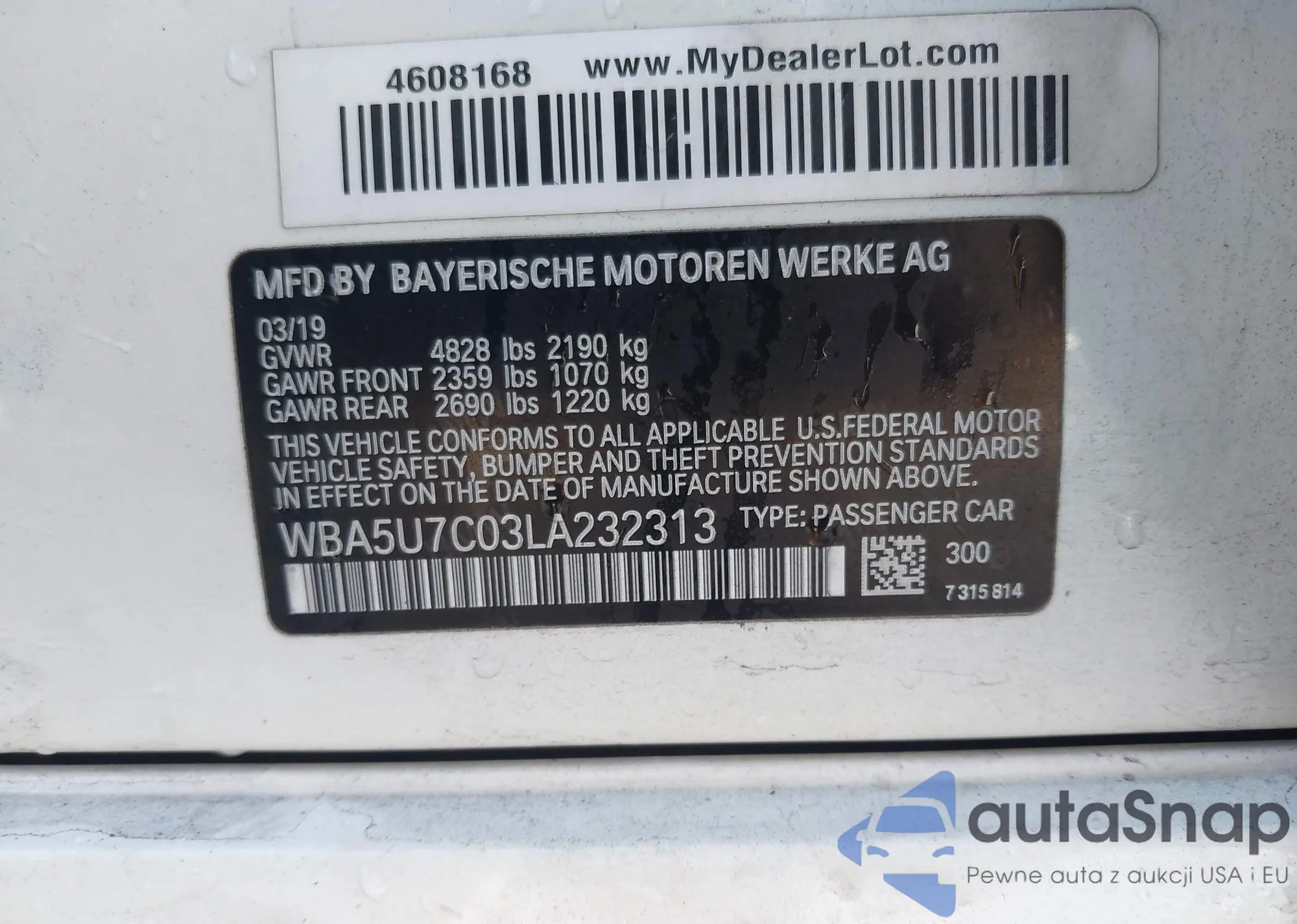 The car BMW 3er 2020 (VIN WBA5U7C03LA232313) has not been auctioned before. The documents are clean, and the mileage matches or is below the market average. Sold by an insurance company – we recommend purchase. Delivery to the port will take approx. 6–8 weeks.