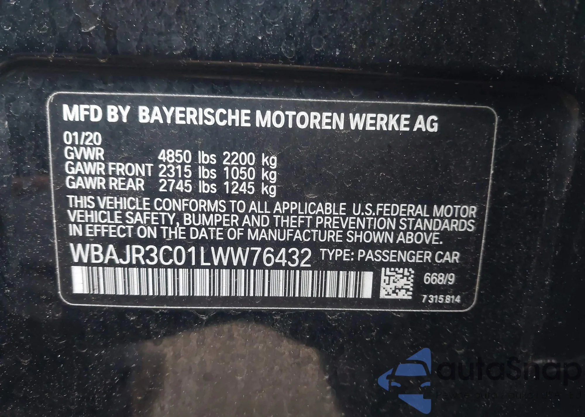 VIN: WBAJR3C01LWW76432