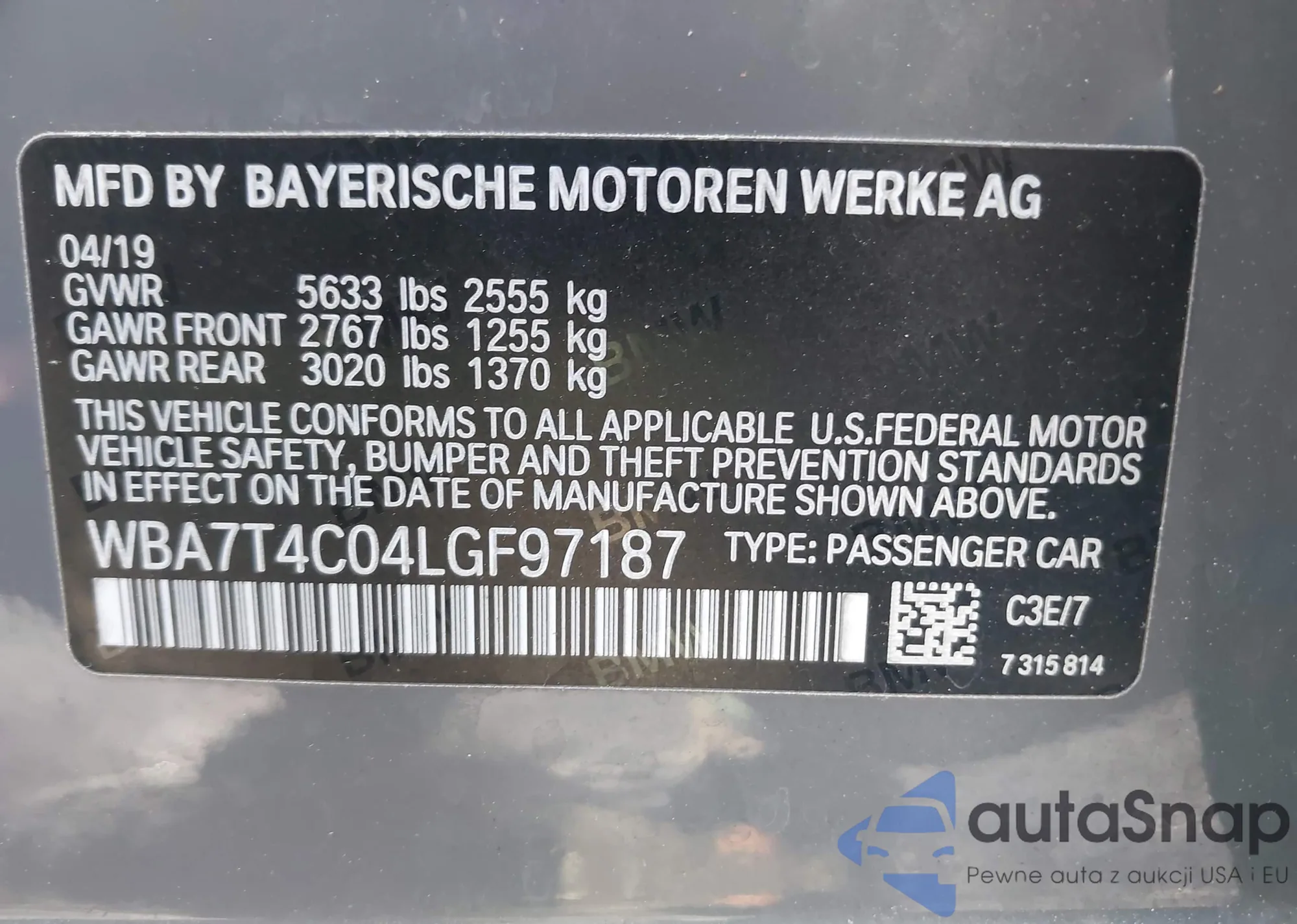 VIN: WBA7T4C04LGF97187