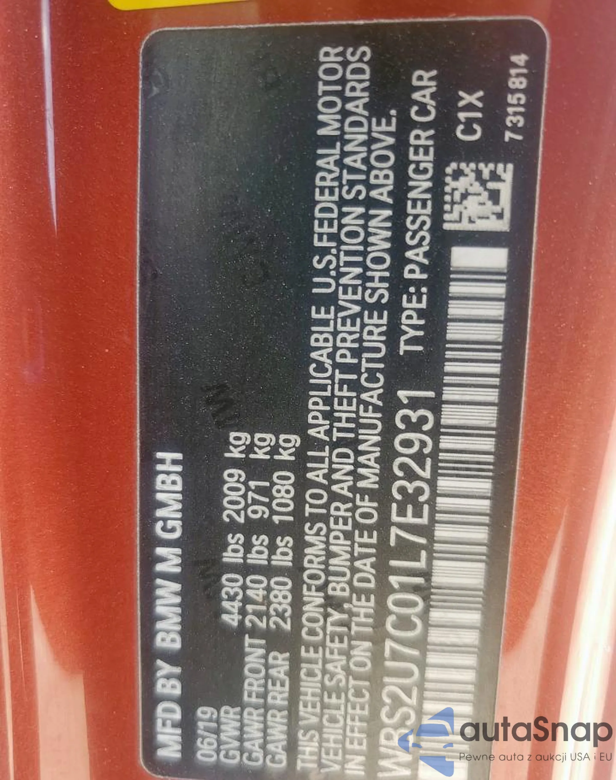 The car BMW M2 2020 (VIN WBS2U7C01L7E32931) has documents that prevent registration. Export and registration may be difficult. Contact AutaSnap experts to find alternatives.