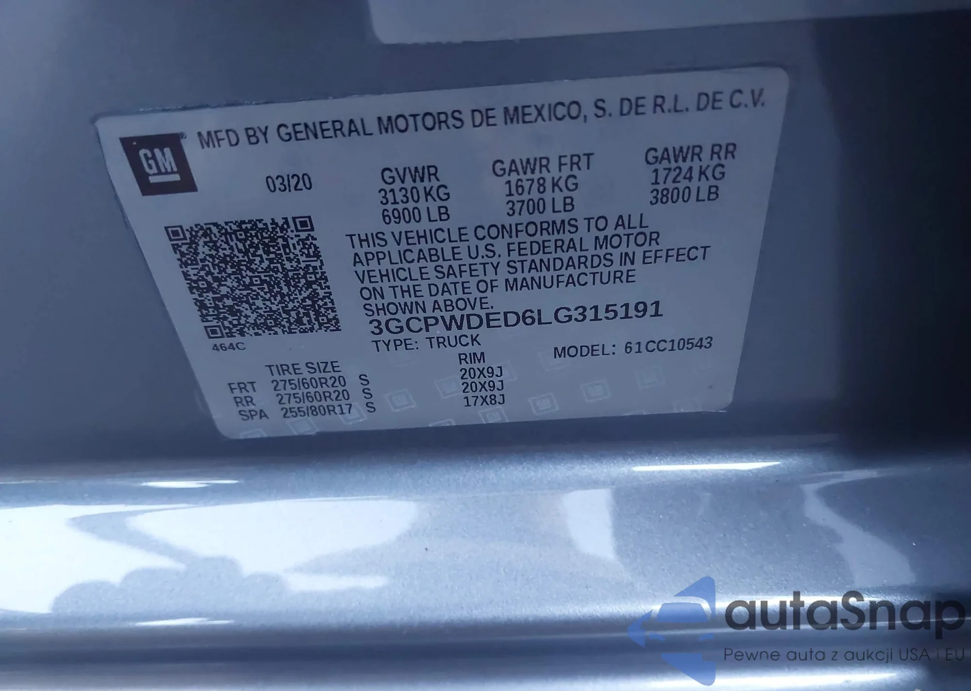 • VIN: 3GCPWDED6LG315191