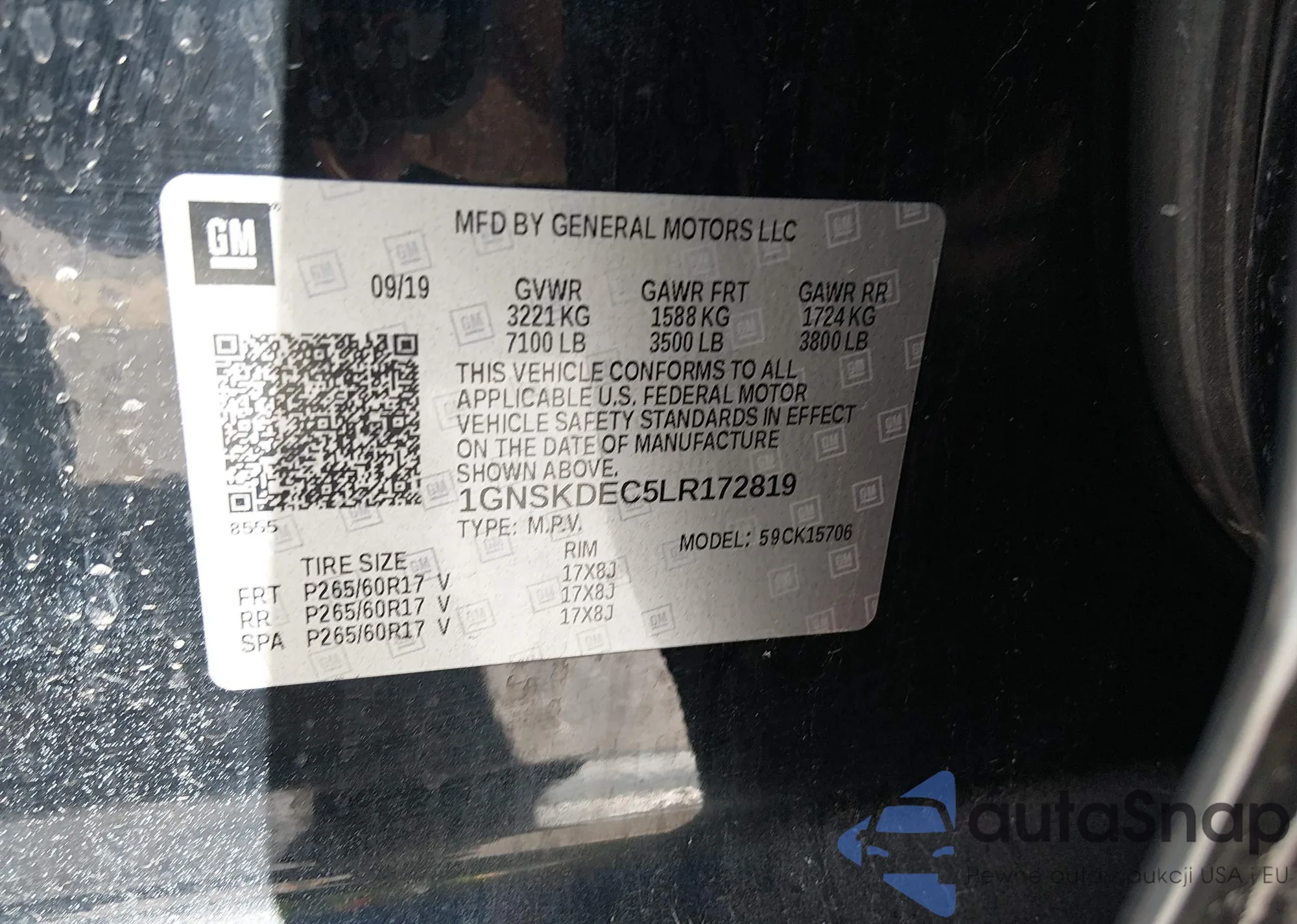 The car Chevrolet Tahoe 2020 (VIN 1GNSKDEC5LR172819) is sold by an unverified seller. We recommend checking the Carfax report and confirming registration possibilities before purchase.